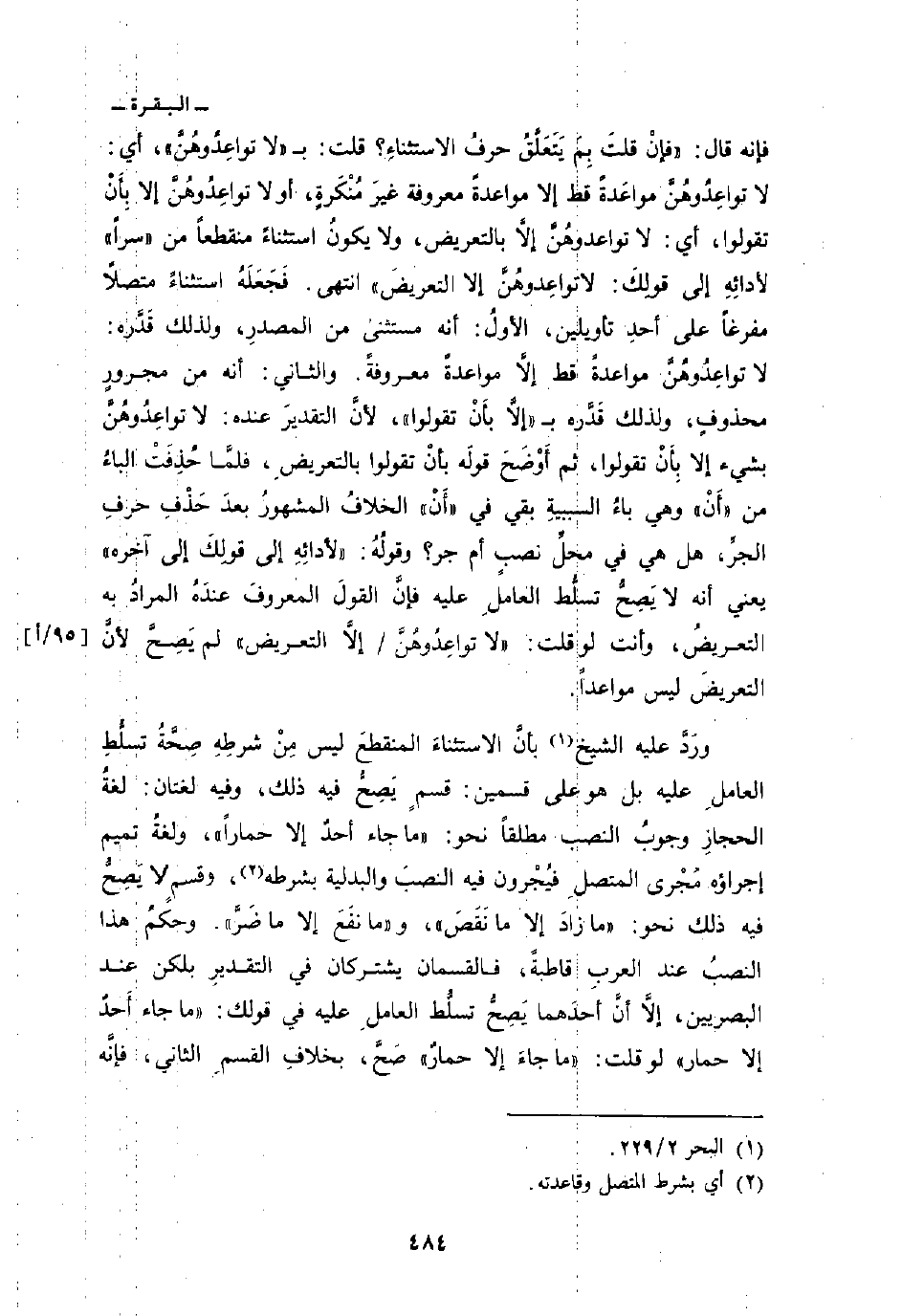 ورَدَّ عليه الشيخ بأنَّ الاستثناءَ المنقطعَ ليس مِنْ شرطِهِ صِحَّةُ تسلُّطِ العاملِ عليه بل هو على قسمين: قسمٍ يَصِحُّ فيه ذلك، وفيه لغتان: لغةُ الحجازِ وجوبُ النصب مطلقاً نحو: «ما جاء أحدُ ألا حماراً» ، ولغةُ تميم إجراؤه مُجْرى المتصلِ فيُجْرون فيه النصبَ والبدلية بشرطه، وقسم لا يَصِحُّ فيه ذلك نحو: «ما زادَ إلا ما نَقَصَ» ، و «ما نفَعَ إلا ما ضَرَّ» . وحكمُ هذا النصبُ عند العربِ قاطبةً، فالقسمان يشتركان في التقديرِ بلكن عند البصريين، إلاَّ أنَّ أحدَهما يَصِحُّ تسلُّط العاملِ عليه في قولك: «ما جاء أَحدٌ إلا حمار» لو قلت: «ما جاءَ إلا حمارٌ» صَحَّ بخلافِ القسمِ الثاني، فإنَّه
