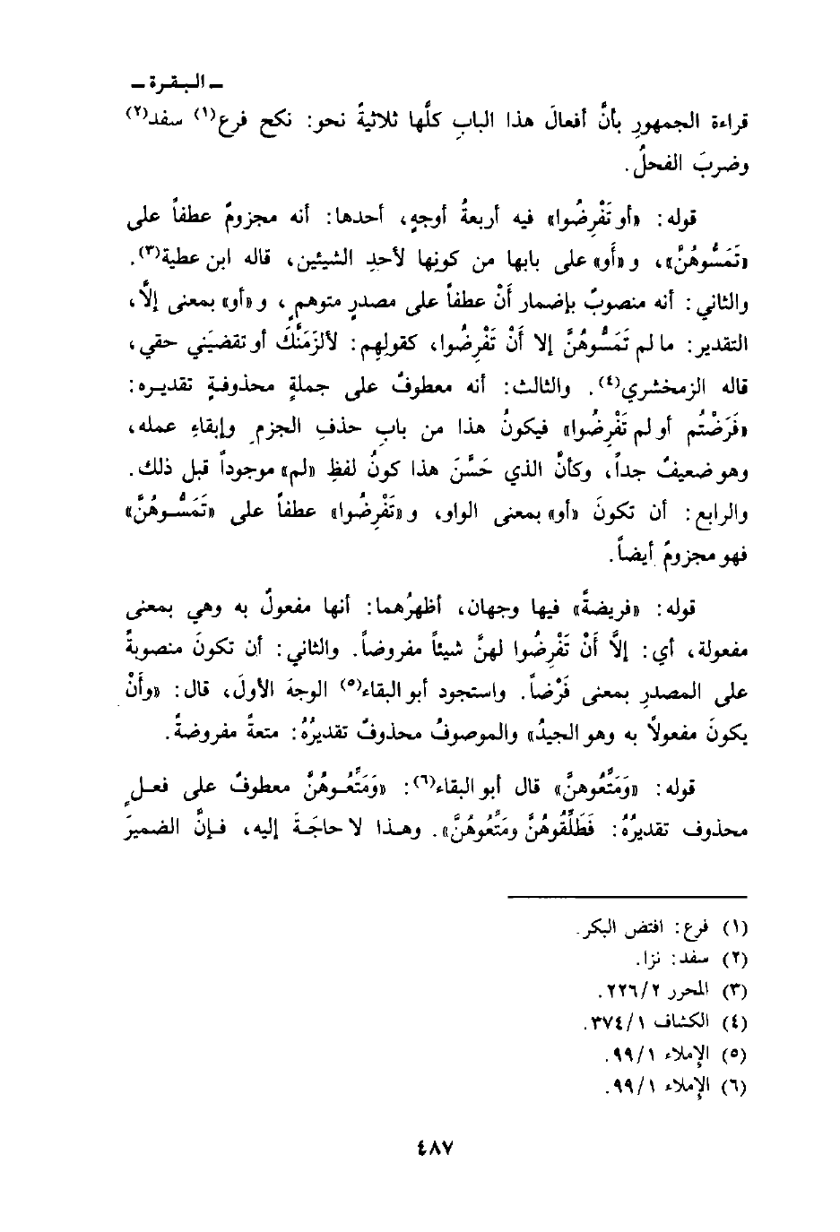قوله: {أَوْ تَفْرِضُواْ} فيه أربعةُ أوجهٍ، أحدها: أنه مجزومٌ عطفاً على «تَمَسُّوهُنَّ» ، و «أَو» على بابها من كونِها لأحدِ الشيئين، قاله ابن عطية. والثاني: أنه منصوبٌ بإضمار أَنْ عطفاً على مصدرٍ متوهمٍ، و «أو» بمعنى إلاَّ التقدير: ما لم تَمَسُّوهُنَّ إلا أَنْ تَفْرِضُوا، كقولِهِم: لألزَمَنَّكَ أو تقضيَني حقي، قاله الزمخشري. والثالث: أنه معطوفٌ على جملةٍ محذوفةٍ تقديره: «فَرَضْتُم أو لم تَفْرِضُوا» فيكونُ هذا من بابِ حذفِ الجزمِ وإبقاءِ عمله، وهو ضعيفٌ جداً، وكأنَّ الذي حَسَّنَ هذا كونُ لفظِ «لم» موجوداً قبل ذلك. والرابع: أن تكونَ «أو» بمعنى الواو، و «تَفْرِضُوا» عطفاً على «تَمَسُّوهُنَّ» فهو مجزومٌ أيضاً.