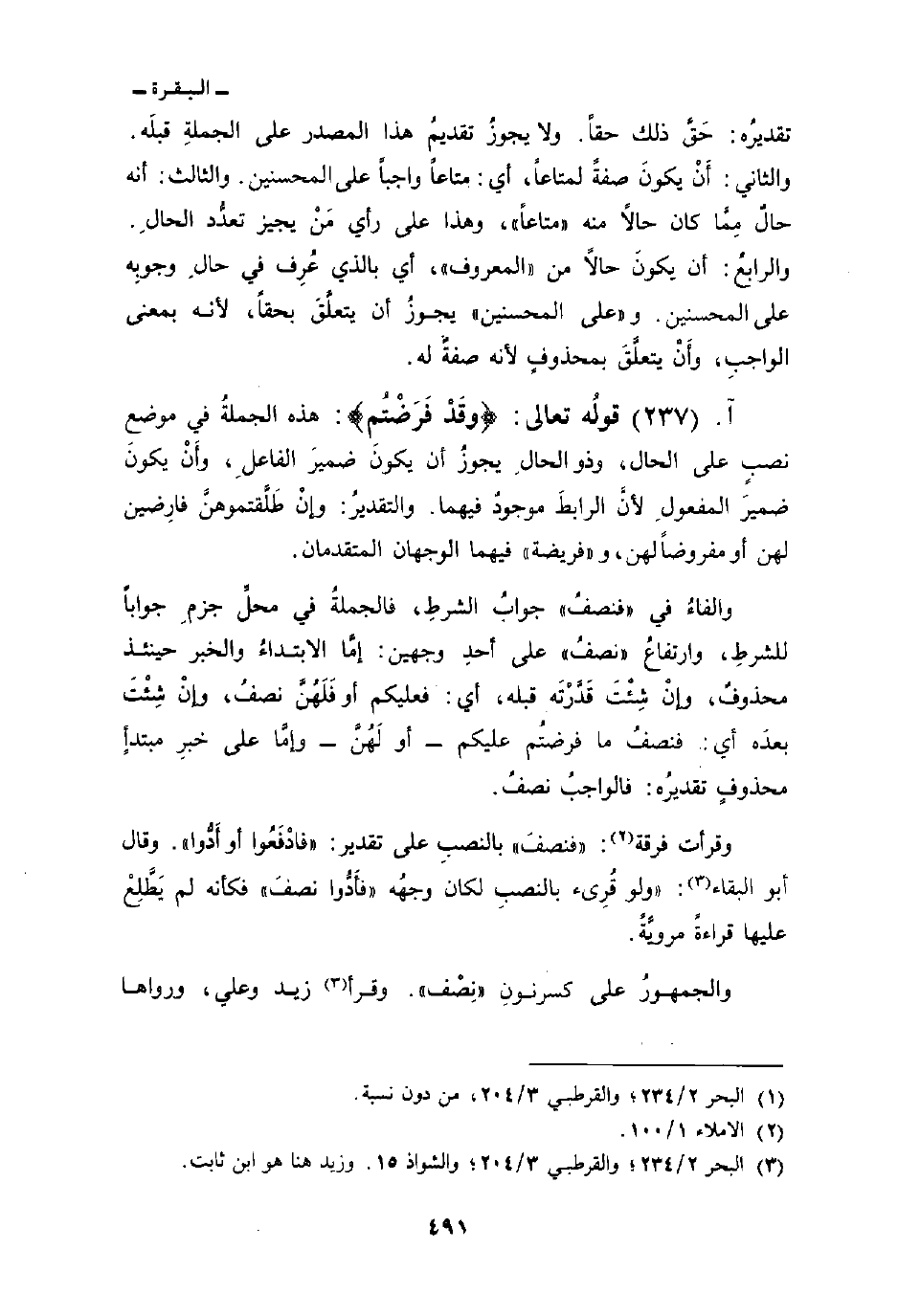 وقرأ فرقة: «فنصفَ» بالنصبِ على تقدير: «فادْفَعُوا أو أَدُّوا» . وقال أبو البقاء: ولو قُرِىء بالنصبِ لكان وجهُه «فأَدُّوا نصفَ» فكأنه لم يَطَّلِعْ عليها قراءةً مرويَّةً.