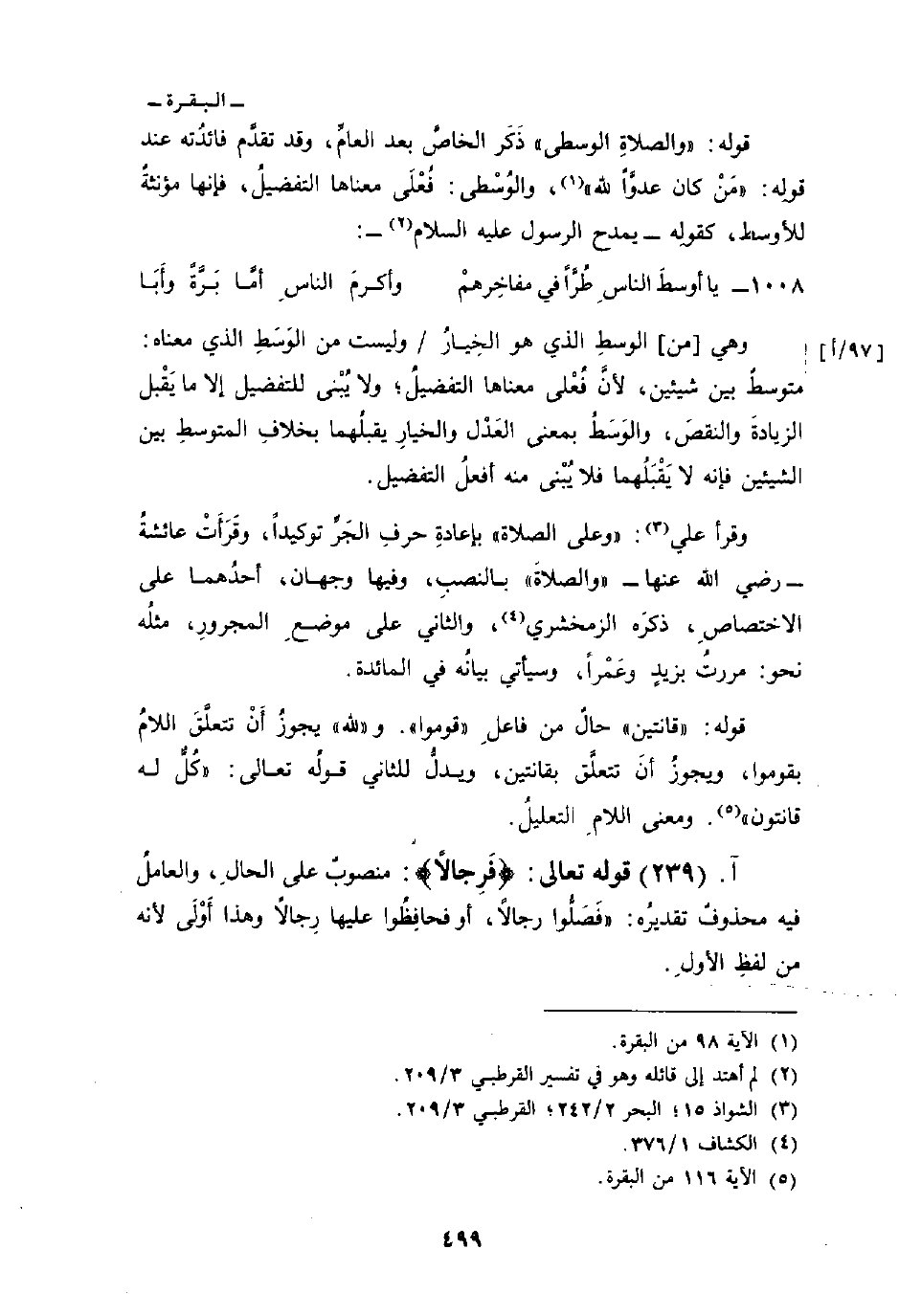 قوله: {والصلاة الوسطى} ذَكَر الخاصَّ بعد العامَّ، وقد تقدَّم فائدُته عند قولِه: {مَن كَانَ عَدُوّاً للَّهِ} [البقرة: 98] ، والوُسْطى: فُعْلَى معناها التفضيلُ، فإنها مؤنثةٌ للأوسط، كقولِه - يمدح الرسول عليه السلام -: