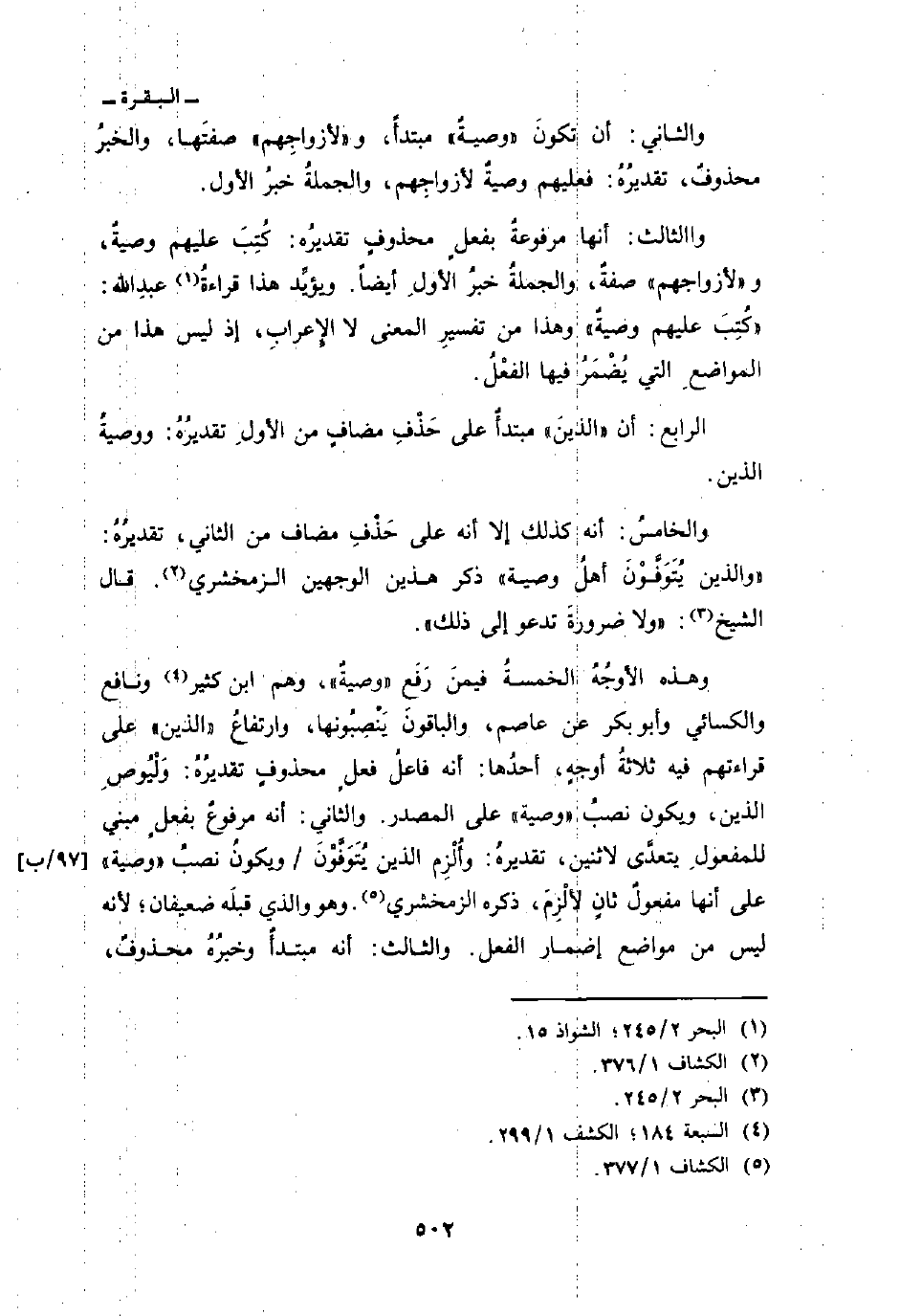 والخامسُ: أنه كذلك إلا أنه على حَذْفِ مضاف من الثاني: تقديرُهُ:» والذين يُتَوَفَّوْنَ أهلُ وصية «ذكر هذين الوجهين الزمخشري. قال الشيخ:» ولا ضرورةَ تدعو إلى ذلك «.