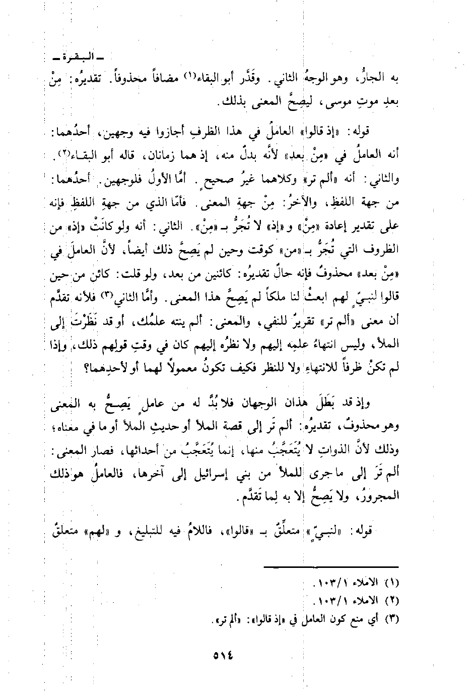 وإذ قد بَطَلَ هذان الوجهان فلا بُدَّ له من عاملٍ يَصِحُّ به المعنى وهو محذوفٌ، تقديرُه: ألم تَر إلى قصة الملأ أو حديثِ الملأ أو ما في معناه؛ وذلك لأنَّ الذواتِ لا يُتَعَجَّبُ منها، إنما يُتَعَجَّبُ من أحداثها، فصار المعنى: ألم تَرَ إلى ما جرى للملأ من بني إسرائيل إلى آخرها، فالعاملُ هو ذلك المجرورُ، ولا يَصِحُّ إلا به لِما تَقدَّم.