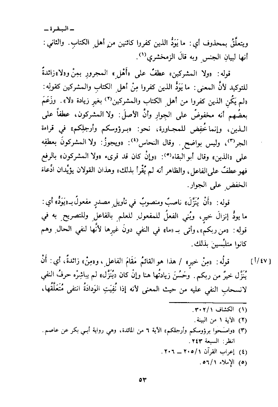 قوله: {وَلاَ المشركين} عطفٌ على «أَهْلِ» المجرورِ بمِنْ و «لا» زائدةٌ للتوكيد لأنَّ المعنى: ما يَوَدُّ الذين كفروا مِنْ أهلِ الكتابِ والمشركين كقولِه: {لَمْ يَكُنِ الذين كَفَرُواْ مِنْ أَهْلِ الكتاب والمشركين} [البينة: 1] بغيرِ زيادة «لا» . وزعَمَ بعضُهم أنه مخفوضٌ على الجِوار وأنَّ الأصلَ: ولا المشركون، عطفاً على الذين وإنما خُفِض للمجاورة، نحو: «برؤوسكم وأرجلكِم» في قراءة الجر، وليس بواضح. وقال النحاس: «ويجوزُ: ولا المشركونَ بعطفِه على» الذين «وقال أبو البقاء:» وإنْ كان قد قرىء «ولا المشركون» بالرفع فهو عطفٌ على الفاعل، والظاهر أنه لم يُقْرأ بذلك «وهذان القولان يؤيِّدان ادِّعاءَ الخفضِ في الجوار.
