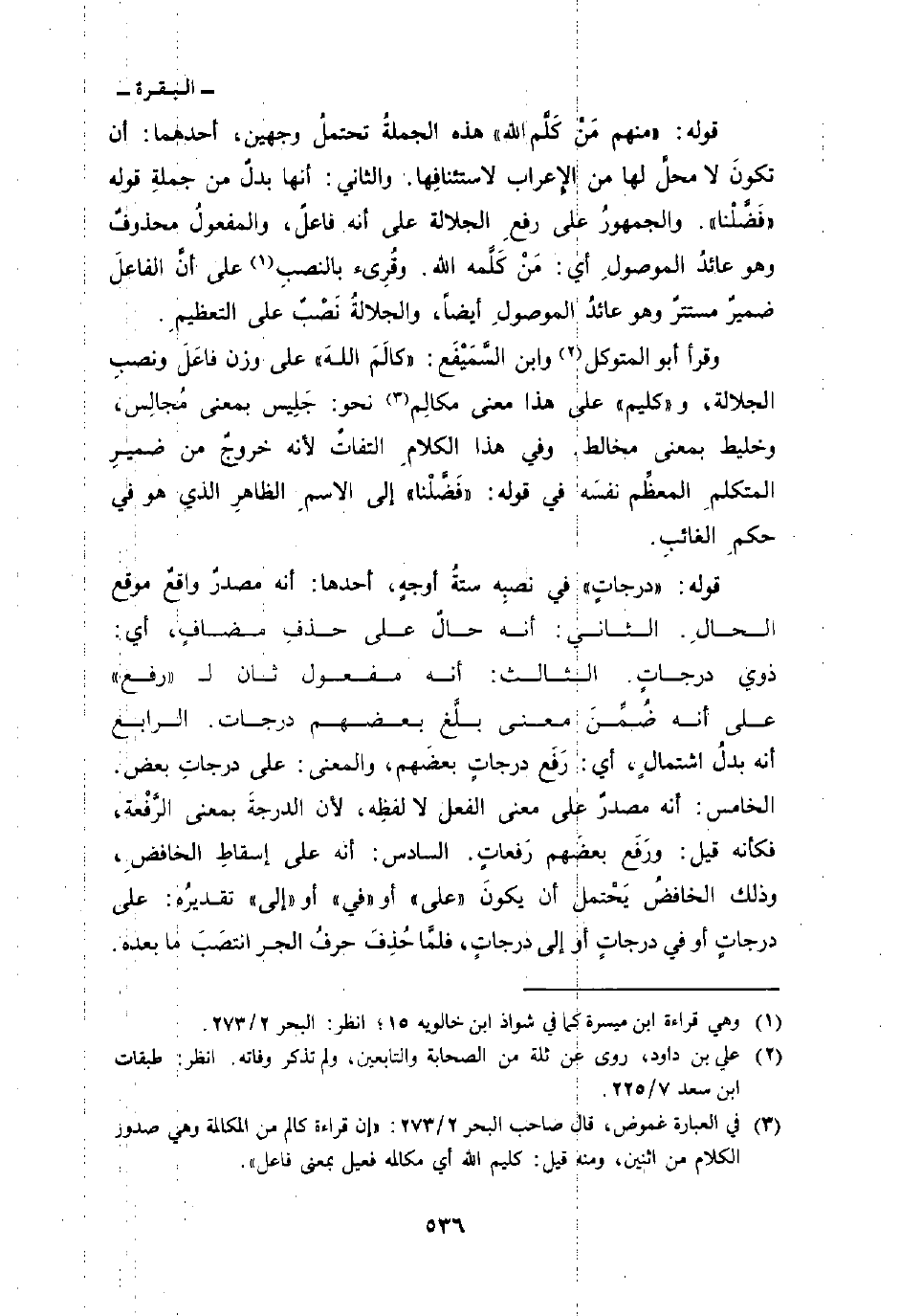 قوله: {مِّنْهُمْ مَّن كَلَّمَ الله} هذه الجملةُ تحتملُ وجهين، أحدهما: أن تكونَ لا محلَّ لها من الإِعراب لاستئنافِها. والثاني: أنها بدلٌ من جملةِ قوله «فَضَّلْنا» والجمهورُ على رفعِ الجلالة على أنه فاعلٌ، والمفعولُ محذوفٌ وهو عائدُ الموصولِ أي: مَنْ كَلَّمه الله. وقُرِىء بالنصبِ على أنَّ الفاعلَ ضميرٌ مستترٌ وهو عائدٌ الموصولِ أيضاً، والجلالةُ نَصْبٌ على التعظيمِ.