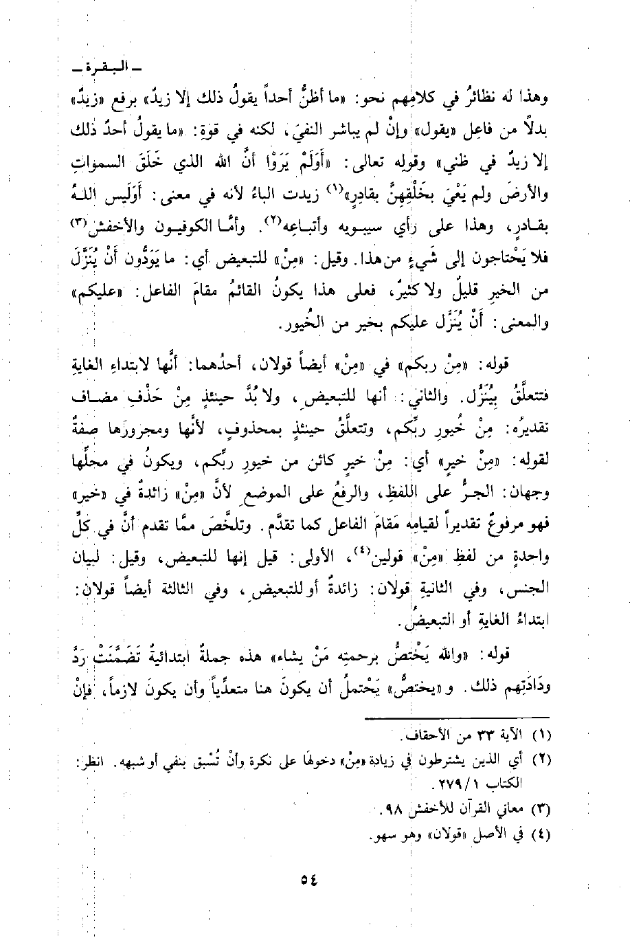 وتلخَّصَ ممَّا تقدم أنَّ في كلِّ واحدةٍ من لفظِ «مِنْ» قولين، الأولى: قيل إنها للتبعيض، وقيل: لبيان الجنس، وفي الثانيةِ قولان: زائدةٌ أو للتبعيضِ، وفي الثالثة أيضاً قولان ابتداءُ الغايةِ أو التبعيضُ.