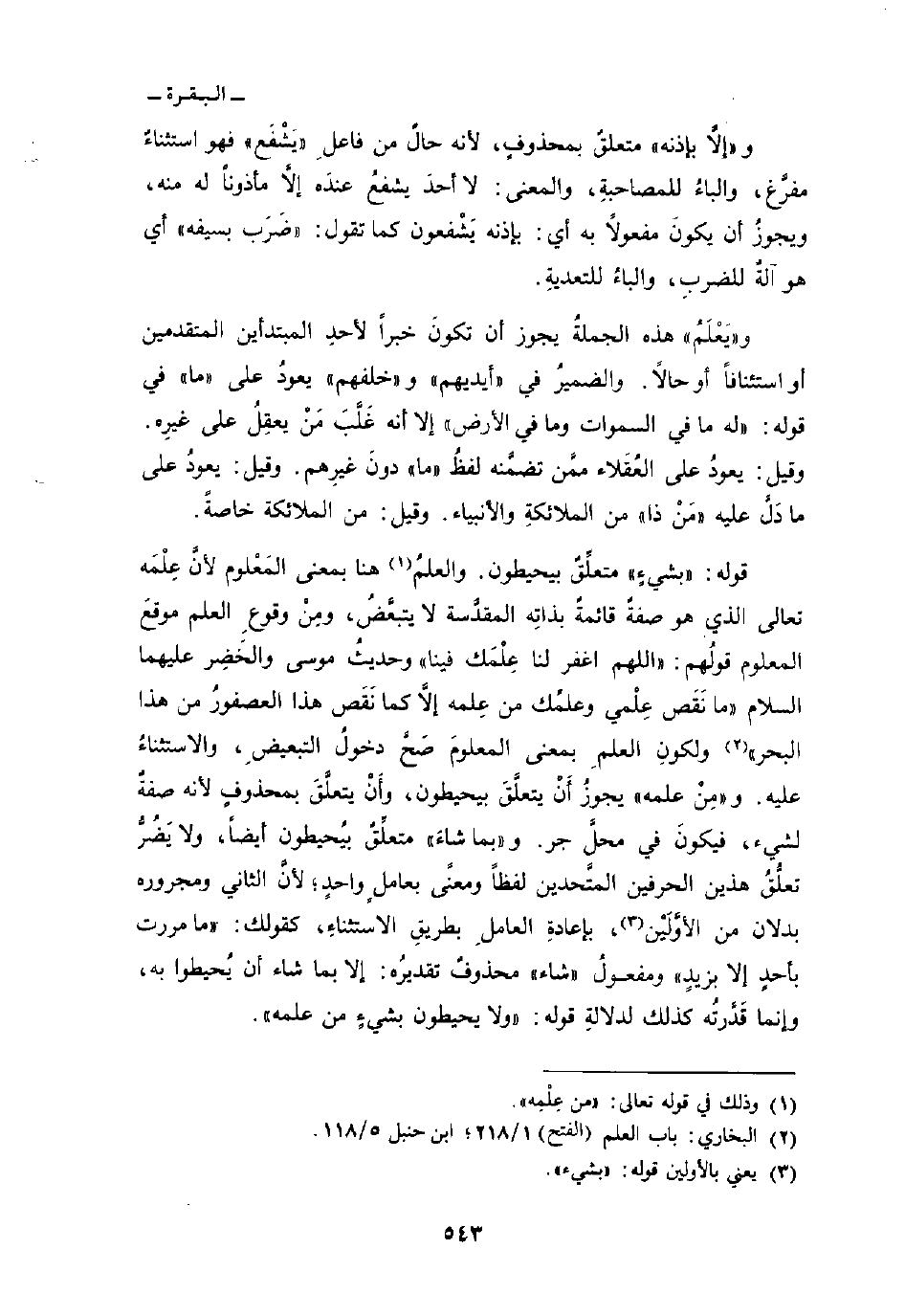 و «يَعْلَمُ» هذه الجملةُ يجوز أن تكونَ خبراً لأحدِ المبتدأين المتقدمين أو استئنافاً أو حالاً. والضميرُ في «أيديهم» و «خلفهم» يعودُ على «ما» في قوله: {لَّهُ مَا فِي السماوات وَمَا فِي الأرض} إنه غَلَّبَ مَنْ يعقِلُ على غيرِه. وقيل: يعودُ على العُقَلاء ممَّن تضمَّنه لفظُ «ما» دونَ غيرِهم. وقيل: يعودُ على ما دَلَّ عليه «مَنْ ذا» من الملائكةِ والأنبياء. وقيل: من الملائكة خاصةً.