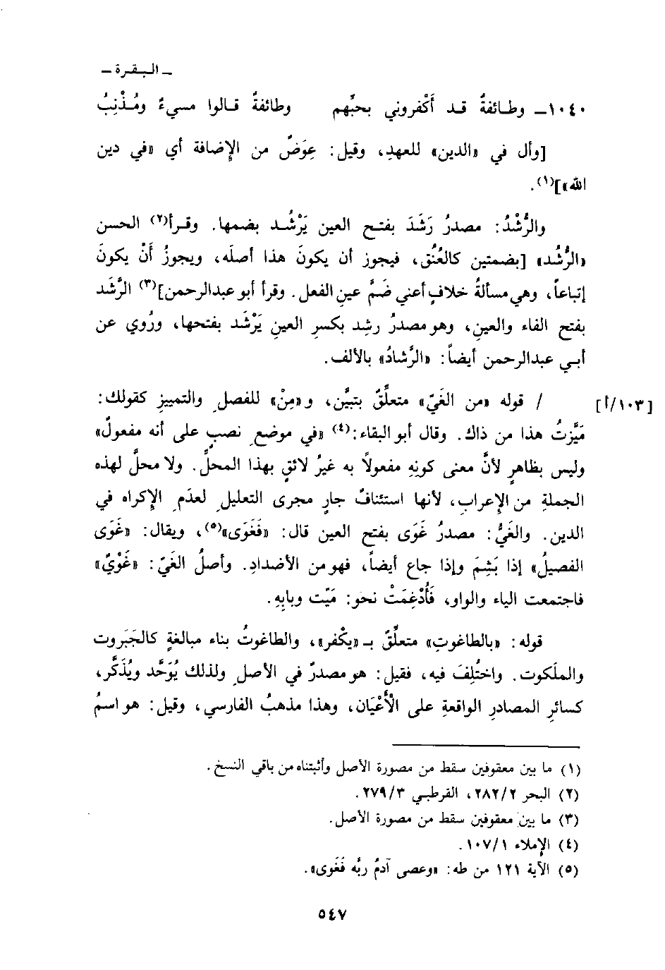 قوله: {بالطاغوت} متعلِّقٌ ب «يكْفر» ، والطاغوتُ بناء مبالغةٍ كالجَبَروت والملَكوت. واختُلِفَ واختُلِفَ فيه، فقيل: هو مصدرٌ في الأصلِ ولذلك يُوَحَّد ويُذَكَّر، كسائرِ المصادرِ الواقعةِ على الأَعْيَان، وهذا مذهبُ الفارسي، وقيل: هو اسمُ