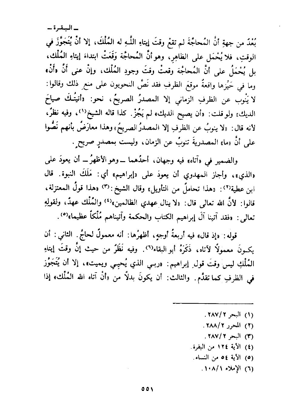 بُعْدٌ من جهةِ أنَّ المُحاجَّةَ لم تقعْ وقتَ إيتاءِ اللهِ له المُلْكَ، إلا أنْ يُتَجَوَّزَ في الوقتِ، فلا يُحْمَل على الظاهِرِ، وهو أنَّ المُحاجَّة وَقَعَتْ ابتداءَ إيتاءِ المُلْك، بل يُحْمَلُ على أنَّ المُحاجَّة وقعتْ وقتَ وجودِ المُلْك، وإنْ عنى أَنْ «أَنْ» وما في حَيَّزها واقعةٌ موقعَ الظرفِ فقد نَصَّ النحويون على منعِ ذلك وقالوا: لا يَنْوب عن الظرفِ الزماني إلا المصدرُ الصريحُ، نحو: «أتيتُك صياحَ الديك» ولو قلت: «أن يصيح الديك» لم يَجُزْ. كذا قاله الشيخ، وفيه نظرٌ، لأنه قال: «لا ينوبُ عن الظرفِ إلا المصدرُ الصريحُ» وهذا معارَضٌ بأنهم نَصُّوا على أنَّ «ما» المصدريةَ تنوبُ عن الزمان، وليست بمصدرٍ صريحٍ.