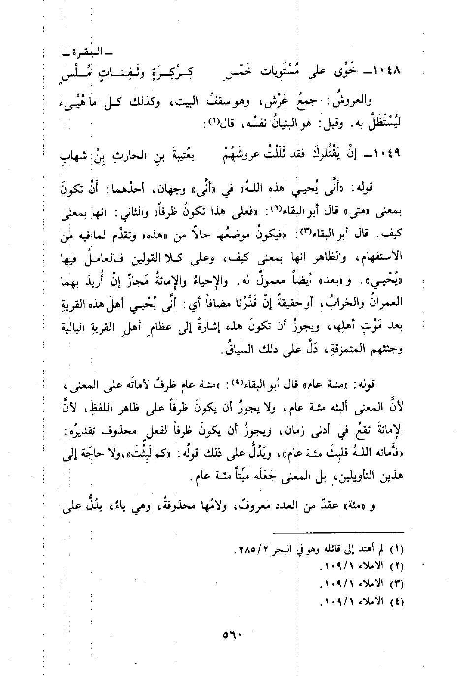 قوله: {أنى يُحْيِي هذه الله} في «أنِّى» وجهان، أحدُهما: أَنْ تكونَ بمعنى «متى» قال أبو البقاء: «فعلى هذا تكونُ ظرفاً» والثاني: انها بمعنى كيف. قال أبو البقاء: فيكونُ موضعُها حالاً من «هذه» وتقدَّم لما فيه من الاستفهام، والظاهر انها بمعنى كيف، وعلى كلا القولين فالعاملُ فيها «يُحْيي» . و «بعد» أيضاً معمولٌ له. والإِحياءُ والإِماتةُ مَجازٌ إنْ أُريدَ بهما العمرانُ والخرابُ، أو حقيقةٌ إنْ قَدَّرْنا مضافاً أي: أنَّى يُحْيي أهلَ هذه القريةِ بعد مَوْتِ أهلِها، ويجوزُ أن تكونَ هذه إشارةً إلى عظامِ أهلِ القريةِ البالية وجثثهم المتمزقةِ، دَلَّ على ذلك السياقُ.