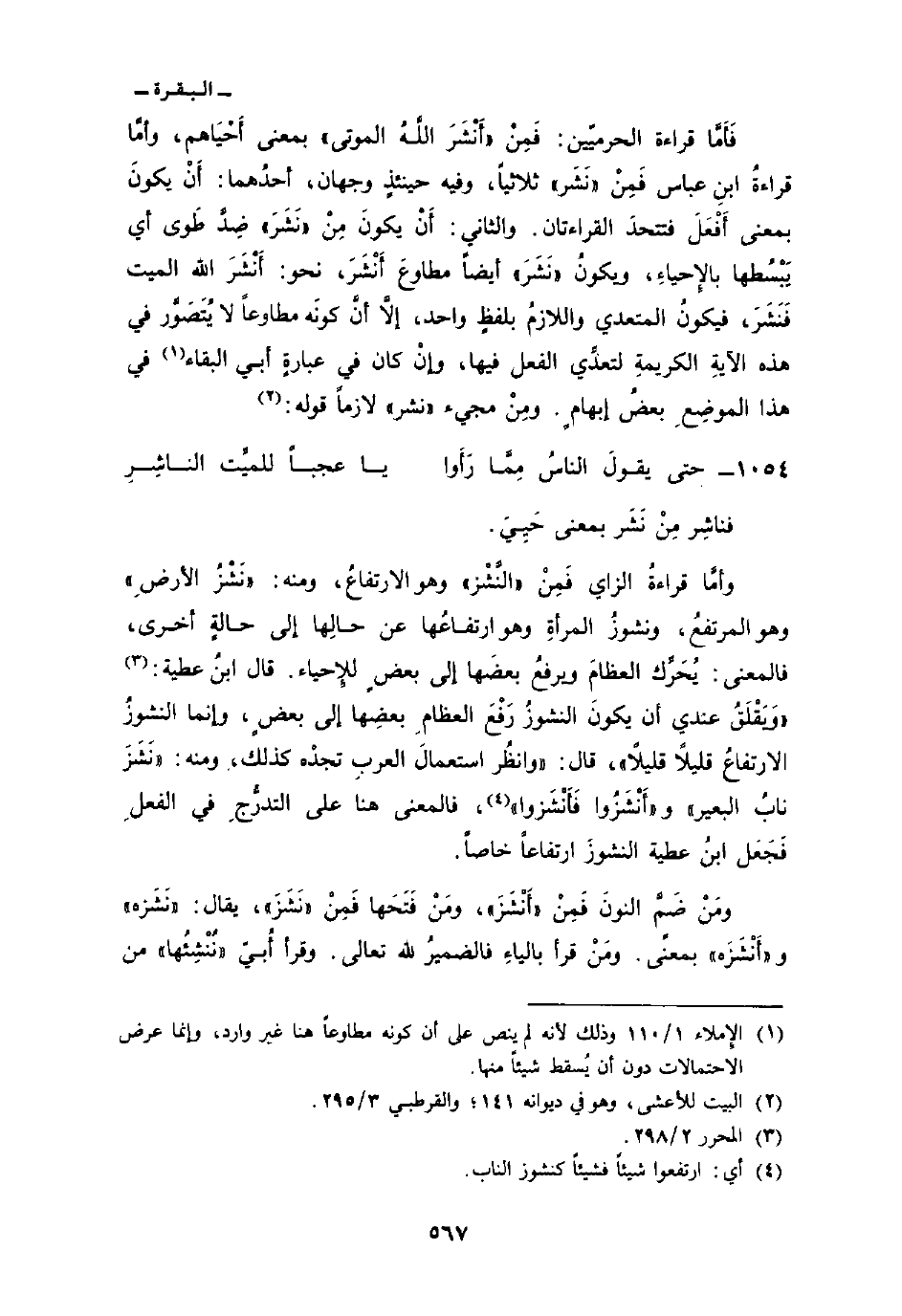 فَأَمَّا قراءة الحرميّين: فَمِنْ «أَنْشَرَ اللَّهُ الموتى» بمعنى أَحْيَاهم، وأمَّا قراءةُ ابنِ عباس فَمِنْ «نَشَر» ثلاثياً، وفيه حينئذٍ وجهان، أحدُهما: أَنْ يكونَ بمعنى أَفْعَلَ فتتحدَ القراءتان. والثاني: أَنْ يكونَ مِنْ «نَشَرَ» ضِدَّ طَوى أي يَبْسُطها بالإِحياءِ، ويكونُ «نَشَرَ» أيضاً مطاوعَ أَنْشَرَ، نحو: أَنْشَرَ الله الميت فَنَشَرَ، فيكونُ المتعدي واللازمُ بلفظٍ واحد، إلاَّ أنَّ كونَه مطاوعاً لا يُتَصَوَّر في هذه الآيةِ الكريمةِ لتعدِّي الفعل فيها، وإنْ كان في عبارةٍ أبي البقاء في هذا الموضِعِ بعضُ إبهامٍ. ومِنْ مجيء «نشر» لازماً قوله: