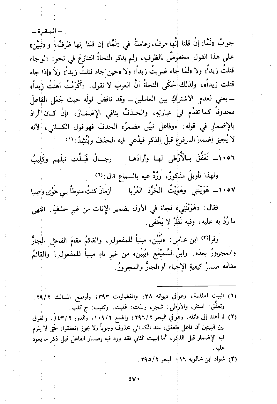 جوابُ «لَمَّا» إنْ قلنا إنَّها حرفٌ، وعاملةٌ في «لَمَّا» إن قلنا إنها ظرفٌ، و «تبيَّن» على هذا القولِ مخفوضٌ بالظرفِ، ولم يذكر النحاةُ التنازعَ في نحو: «لو جاء قتلتُ زيداً» ولا «لَمَّا جاء ضربتُ زيداً» ولا «حين جاء قتلتُ زيداً» ولا «إذا جاء قتلت زيداً» ، ولذلك حَكَى النحاةُ أنَّ العربَ لا تقول: «أَكْرَمْتُ أهنتُ زيداً» - يعني لعدمِ الاشتراكِ بين العاملين - وقد ناقضَ قولَه حيث جَعَل الفاعلَ محذوفاً كما تقدَّم في عبارتِهِ، والحذفُ ينافي الإِضمارَ، فإنْ كان أرادَ بالإِضمارِ في قوله: «وفاعل تبيَّن مضمرٌ» الحذفَ فهو قول الكسائي، لأنه لا يُجيز إضمارَ المرفوع قبلَ الذكر فيدَّعي فيه الحذفَ ويُنْشِدُ: