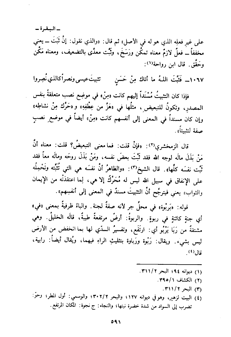 فإذا كان التثبيتُ مُسْنَداً إليهم كانت «مِنْ» في موضِع نصب متعلقةً بنفس المصدرِ، وتكونُ للتبعيضِ، مثلُها في «هَزَّ من عِطْفِهِ» و «حَرَّك مِنْ نشاطِه» وإن كان مسنداً في المعنى إلى أنفسهم كانت «مِنْ» أيضاً في موضعِ نصبٍ صفة لتثبيتاً «.