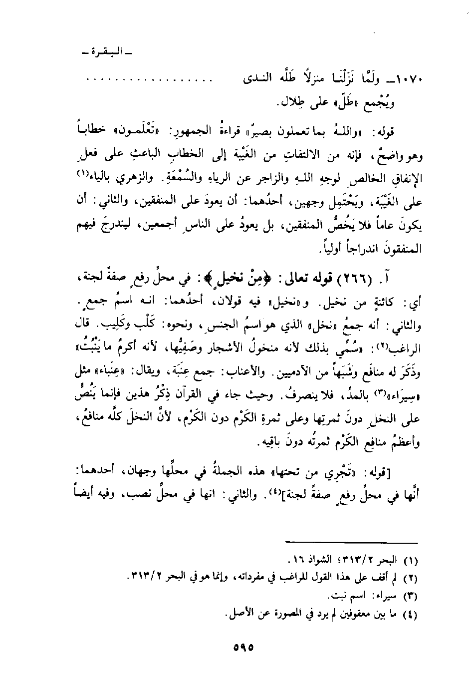 قوله تعالى: {مِّن نَّخِيلٍ} : في محلِّ رفعٍ صفةً لجنة، أي: كائنةٍ من نخيل. و «نخيل» فيه قولان، أحدُهما: أنه اسمُ جمعٍ. والثاني: أنه جمعُ «نخل» الذي هو اسمُ الجنسِ، ونحوه: كَلْب وكَلِيب. قال الراغب: «سُمِّي بذلك لأنه منخولُ الأشجار وصَفِيُّها، لأنه أكرمُ ما يَنْبُتُ» وذَكَرَ له منافَع وشَبَهاً من الآدميين. والأعناب: جمع عِنَبَة، ويقال: «عِنَباء» مثل «سِيرَاء» بالمدِّ، فلا ينصرفُ. وحيث جاء في القرآن ذِكْرُ هذين فإنما يَنُصُّ على النخلِ دونَ ثمرتِها وعلى ثمرةِ الكَرْم دون الكَرْم، لأنَّ النخلَ كلَّه منافعُ، وأعظمُ منافِع الكَرْم ثمرتُه دونَ باقِيه.