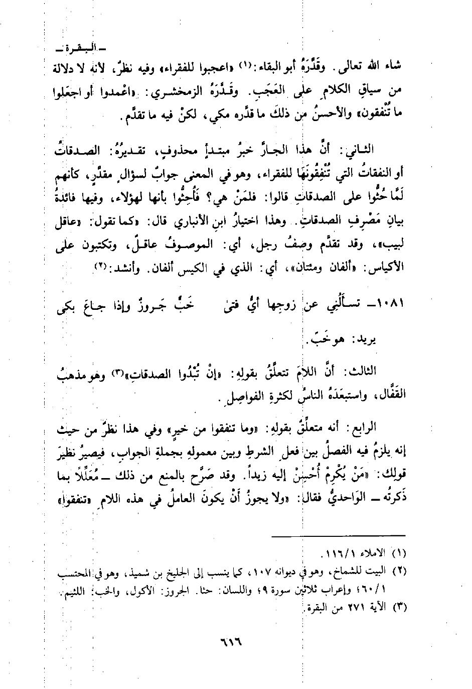 الثاني: أنَّ هذا الجارَّ خبرُ مبتدأٍ محذوفٍ، تقديرُهُ: الصدقاتُ أو النفقاتُ التي تُنْفِقُونَهَا للفقراء، وهو في المعنى جوابٌ لسؤالٍ مقدَّرٍ، كأنهم لَمَّا حُثُّوا على الصدقاتِ قالوا: فلمَنْ هي؟ فَأُحِثُّوا بأنها لهؤلاء، وفيها فائدةُ بيانِ مَصْرِفِ الصدقاتِ. وهذا اختيارُ ابنِ الأنباري قال:» كما تقول: «عاقل لبيب» ، وقد تقدَّم وصفُ رجل، أي: الموصوفُ عاقلٌ، وتكتبون على الأكياس: «ألفان ومئتان» ، أي: الذي في الكيس ألفان. وأنشد: