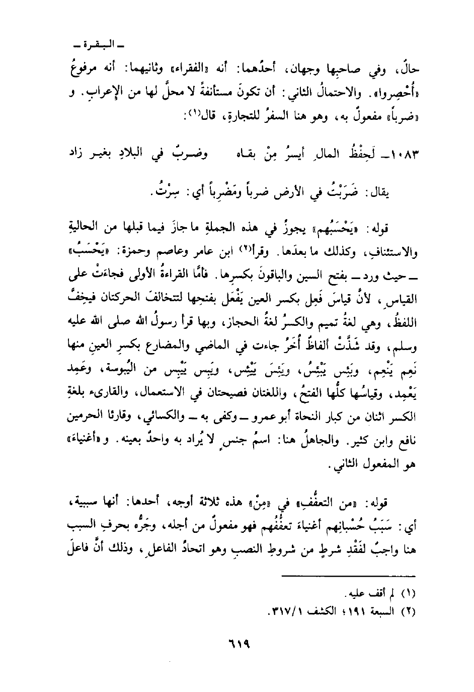 قوله: {مِنَ التعفف} في «مِنْ» هذه ثلاثة أوجه، أحدها: أنها سببية، أي: سَبَبُ حُسْبانِهم أغنياءَ تعفُّفُهم فهو مفعولٌ من أجله، وجَرُّه بحرفِ السبب هنا واجبٌ لفَقْدِ شرطٍ من شروطِ النصبِ وهو اتحادُ الفاعلِ، وذلك أنَّ فاعلَ