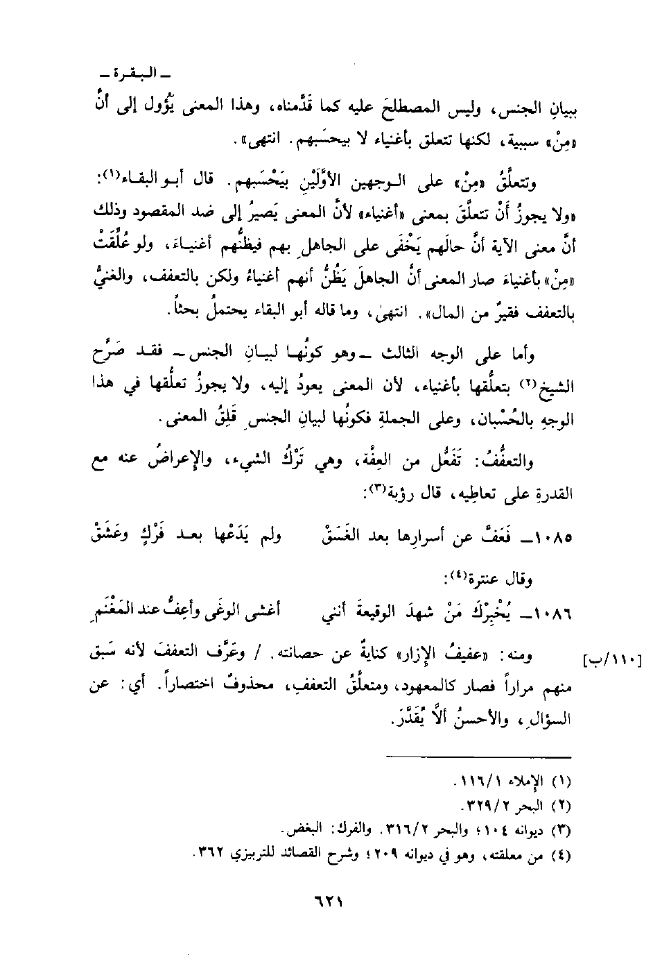 ومنه: «عفيفُ الإِزار» كنايةٌ عن حصانته. / وعَرَّف التعففَ لأنه سَبق منهم مراراً فصار كالمعهود، ومتعلَّقٌ التعففِ، محذوفٌ اختصاراً. أي: عن السؤالِ، والأحسنُ ألاَّ يُقَدَّرَ.