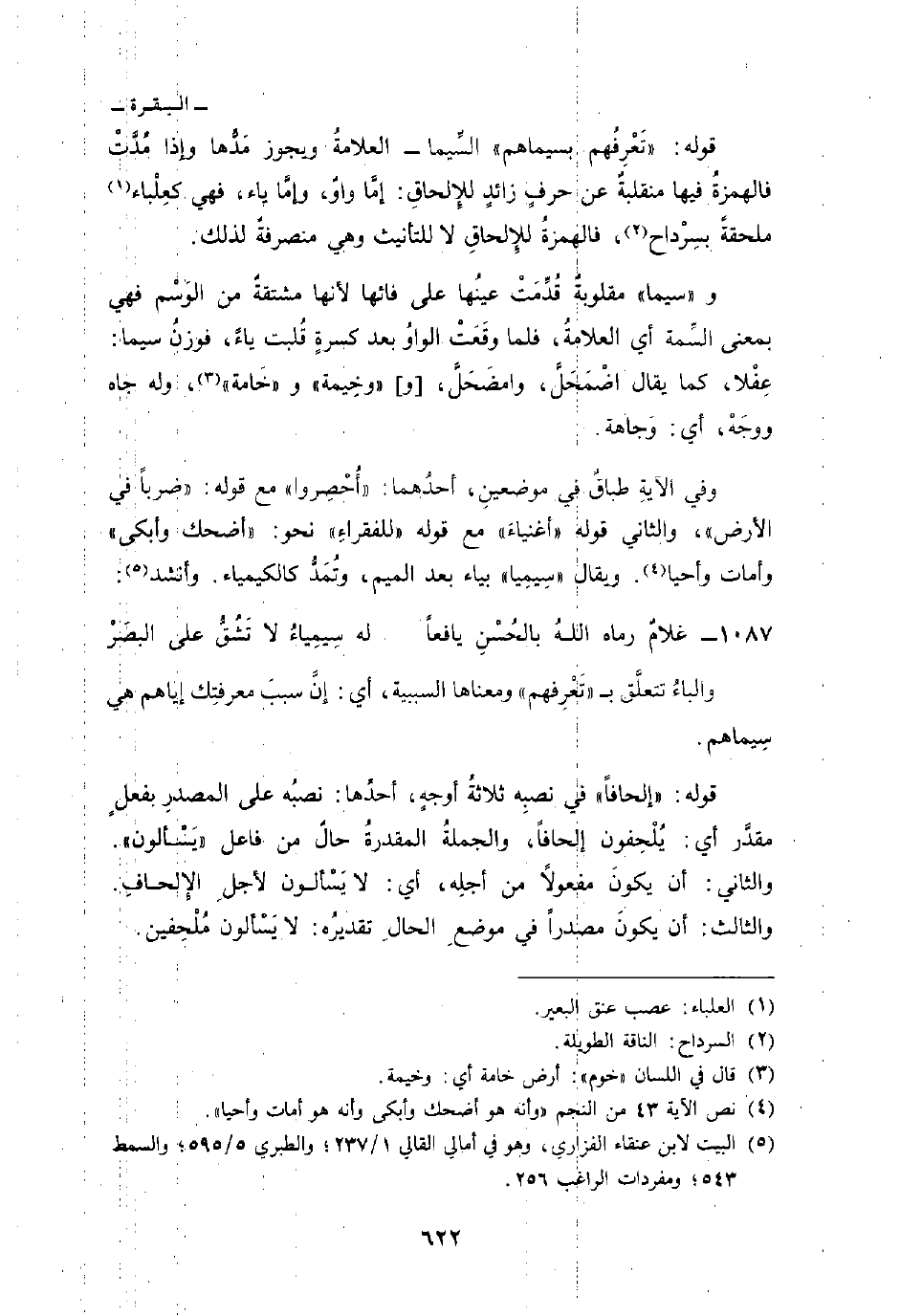 وفي الآيةِ طباقٌ في موضعينِ، أحدُهما: «أُحْصِروا» مع قوله: {ضَرْباً فِي الأرض} ، والثاني قوله «أغنياءَ» مع قوله «للفقراءِ» نحو: {أَضْحَكَ وأبكى} {وَأَمَاتَ وَأَحْيَا} [النجم: 43] . ويقال «سِيمِيا» بياء بعد الميم، وتُمَدُّ كالكيمياء. وأشد:
