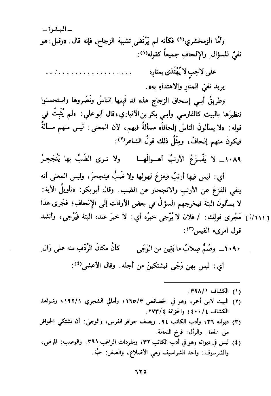 أي: ليس فيها أرنبٌ فيفزعَ لهولِها ولا ضَبُّ فينجحرَ، وليس المعنى أنه ينفي الفزعَ عن الأرنبِ والانجحار عن الضب. وقال أبو بكر: «تأويلُ الآية: لا يسألون البتةَ فيخرجهم السؤالُ في بعض الأوقات إلى الإِلحافِ؛ فجَرى هذا مَجْرى قولِك: / فلان لا يُرْجى خيرُه أي: لا خيرَ عنده البتة فيُرْجى، وأنشد قول امرىء القيس: