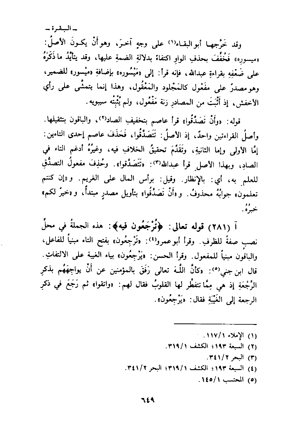 قوله تعالى: {تُرْجَعُونَ فِيهِ} : هذه الجملةُ في محلِّ نصبٍ صفةً للظرفِ. وقرأ أبو عمرو: «تَرْجِعُون» بفتح التاء مبنياً للفاعل، والباقون مبنياً للمفعول. وقرأ الحسن: «يَرْجِعُون» بياء الغيبة على الالتفاتِ. قال ابن جني: «كأنَّ اللَّهَ تعالى رَفَقَ بالمؤمنين عن أَنْ يواجِهَهُم بذكرِ الرَّجْعَةِ إذ هي مِمَّا تتفطَّر لها القلوب فقال لهم:» واتقوا «ثم رَجَعَ في ذكرِ الرجعة إلى الغَيْبَةِ فقال:» يَرْجِعُون «.