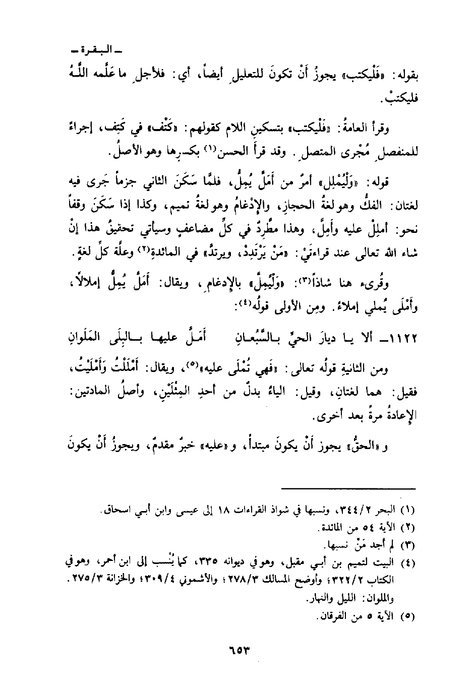 وقُرىء هنا شاذاً: «وَلْيُمِلَّ» بالإِدغامِ، ويقال: أَمَلَّ يُمِلُّ إملالاً، وأَمْلَى يُملي إملاءً. ومِنْ الأولى قولُه: