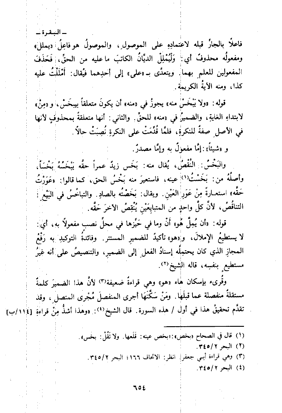 قوله: {وَلاَ يَبْخَسْ مِنْهُ} يجوزُ في «منه» أن يكونَ متعلقاً بيبخَسْ، و «مِنْ» لابتداءِ الغايةِ، والضميرُ في «منه» للحقِّ. والثاني: أنها متعلقة بمحذوفٍ لأنها في الأصلِ صفةٌ للنكرةِ، فلمَّا قُدِّمَتْ على النكرةِ نُصِبَتْ حالاً.