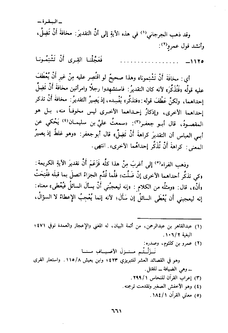 وقد ذهب الجرجاني في هذه الآيةِ إل أنَّ التقديرَ: مخافةَ أَنْ تَضِلَّ، وأنشد قول عمروٍ: