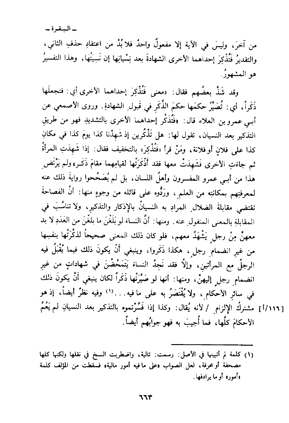 وقد شَذَّ بعضُهم فقال: «معنى فَتُذْكِرَ إحداهما الأخرى أي: فتجعلَها ذَكَراً، أي: تُصَيِّرُ حكمَها حكمَ الذَّكَرِ في قَبولِ الشهادةِ. وروى الأصمعي عن أبي عمرو بن العلاء قال:» فَتُذَكِّر إحداهما الأخرى بالتشديدِ فهو من طريقِ التذكير بعد النسيان، تقول لها: هل تَذْكُرين إذ شَهِدْنا كذا يومَ كذا في مكان كذا على فلانٍ أو فلانة، ومَنْ قرأ «فَتُذْكِرَ» بالتخفيف فقال: إذا شَهِدَتِ المرأةُ ثم جاءَتِ الأخرى فَشَهِدَتْ معها فقد أَذْكَرَتْها لقيامِهما مقامَ ذَكَر «ولم يَرْتَضِ هذا من أبي عمرو المفسرون وأهلُ اللسان، بل لم يُصَحِّحوا روايةَ ذلك عنه لمعرفتِهم بمكانتِه من العلمِ، ورَدُّوه على قائله من وجوهٍ منها: أنَّ الفصاحةَ تقتضي مقابلةَ الضلالِ المرادِ به النسيانُ بالإِذكار والتذكيرِ، ولا تناسُبَ في المقابلةِ بالمعنى المنقولِ عنه. ومنها: أنَّ النساءَ لو بَلَغْنَ ما بلغْنَ من العَدَدِ لا بد معهنَّ مِنْ رجلٍ يَشْهَدُ معهم، فلو كان ذلك المعنى صحيحاً لذكَّرَتْها بنفسِها من غيرِ انضمامِ رجلٍ، هكذا ذَكَروا، وينبغي أَنْ يكونَ ذلك فيما يُقْبَلُ فيه الرجلُ مع المرأتينِ، وإلاَّ فقد نَجِدُ النساءَ يَتَمَحَّضْنَ في شهاداتٍ من غيرِ انضمامِ رجلٍ إليهنَّ، ومنها: أنها لو صَيَّرَتْها ذَكَراً لكان ينبغي أَنْ يكونَ ذلك في سائرِ الأحكامِ، ولا يُقْتَصرُ به على ما فيه.