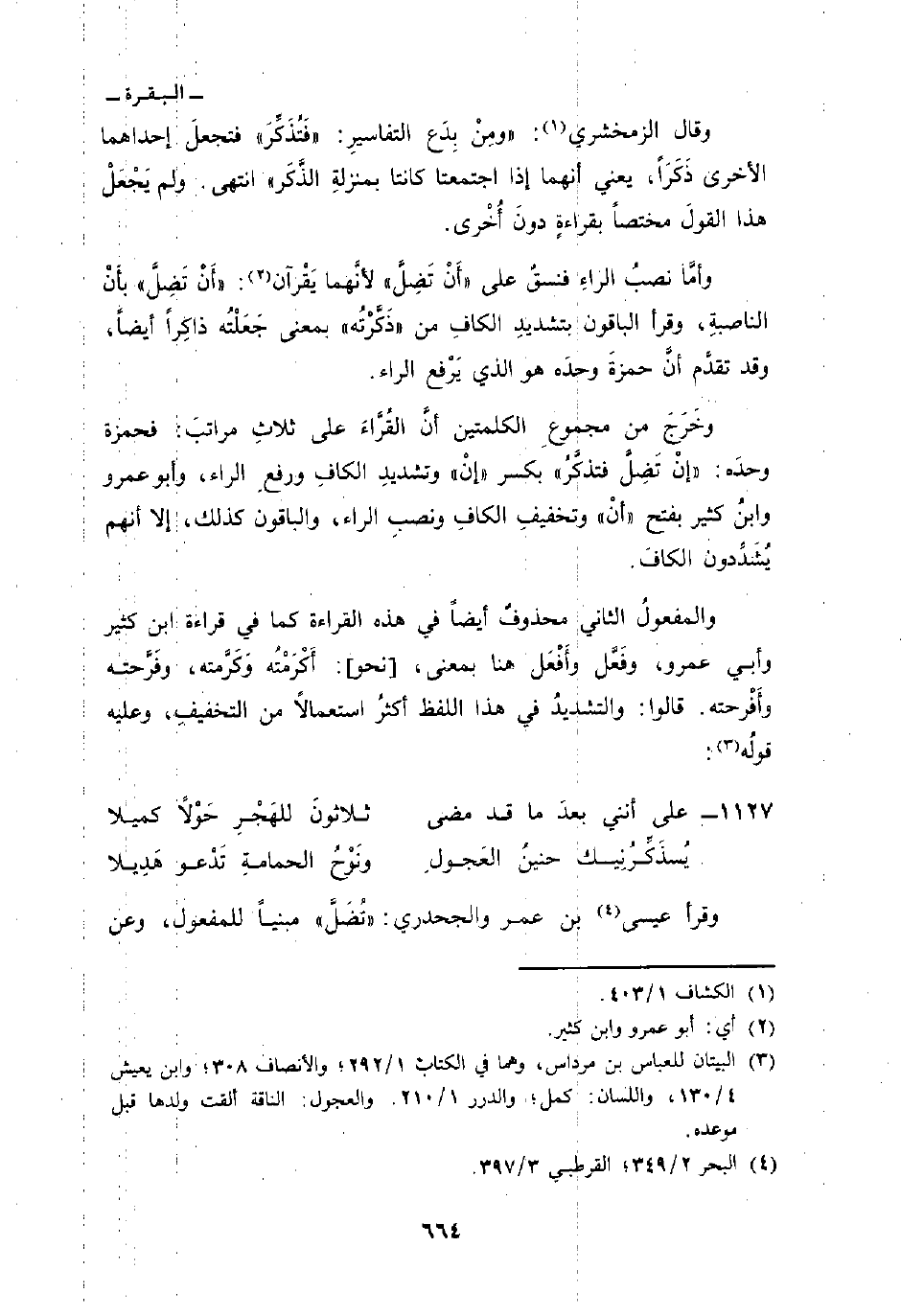 وخَرَجَ من مجموعِ الكلمتين أنَّ القُرَّاءَ على ثلاثِ مراتبَ: فحمزة وحدَه: «إنْ تَضِلَّ فتذكَّرُ» بكسر «إنْ» وتشديدِ الكافِ ورفعِ الراء، وأبو عمرو وابنُ كثير بفتح «أنْ» وتخفيفِ الكافِ الراء، والباقون كذلك، إلا أنهم يُشَدِّدون الكافَ.
