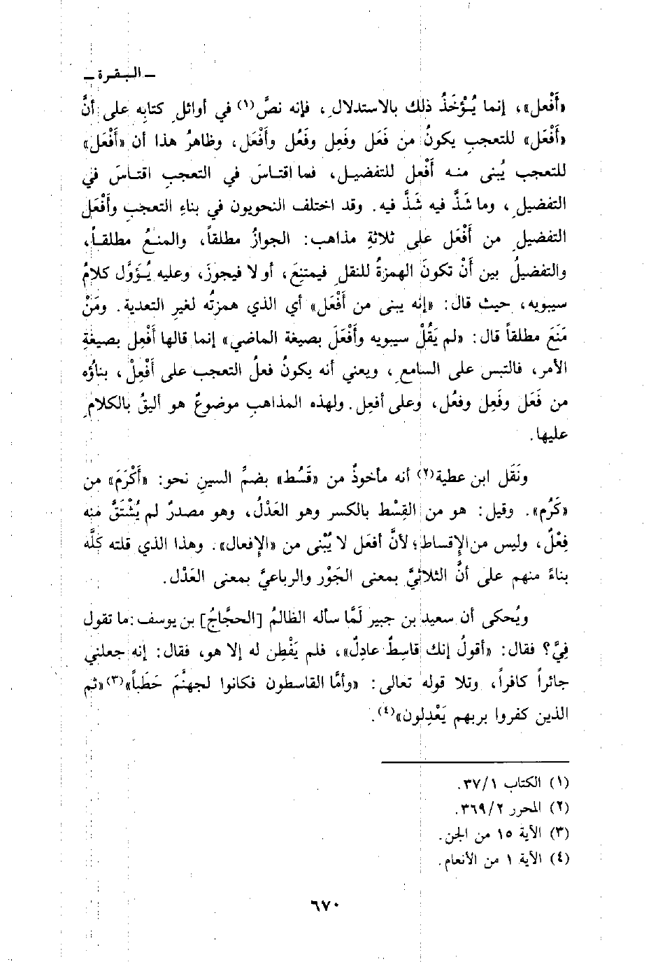 أَفْعل» ، إنما يُؤْخَذُ ذلك بالاستدلالِ، فإنه نصَّ في أوائلِ كتابِه على أنَّ «أَفْعَل» للتعجبِ يكونُ من فَعَل وفَعِل وفَعُل وأَفْعَل، وظاهرُ هذا أن «أَفْعَل» للتعجب يُبنى منه أَفْعل للتفضيل، فما اقتاسَ في التعجب اقتاسَ في التفضيلِ، وما شَذَّ فيه شَذَّ فيه شَذَّ فيه. وقد اختلف النحويون في بناءِ التعجبِ وأَفْعَل التفضيل من أَفْعَل على ثلاثةِ مذاهب: الجوازُ مطلقاً، والمنعُ مطلقاً، والتفضيلُ بين أَنْ تكونَ الهمزةُ للنقلِ فيمتنِعَ، أو لا فيجوزَ، وعليه يُؤَوَّل كلامُ سيبويه، حيث قال: «إنه يبنى من أَفْعَل» أي الذي همزتُه لغيرِ التعدية. ومَنْ مَنَعَ مطلقاً قال: «لم يَقُلْ سيبويه وأَفْعَلَ بصيغة الماضي» إنما قالها أَفْعِل بصيغةِ الأمر، فالتبس على السامعِ، ويعني أنه يكونُ فعلُ التعجب على أَفْعِلْ، بناؤُه من فَعَل وفَعِل وفعُل، وعلى أفعِل. ولهذه المذاهبِ موضوعٌ هو أليقُ بالكلامِ عليها.