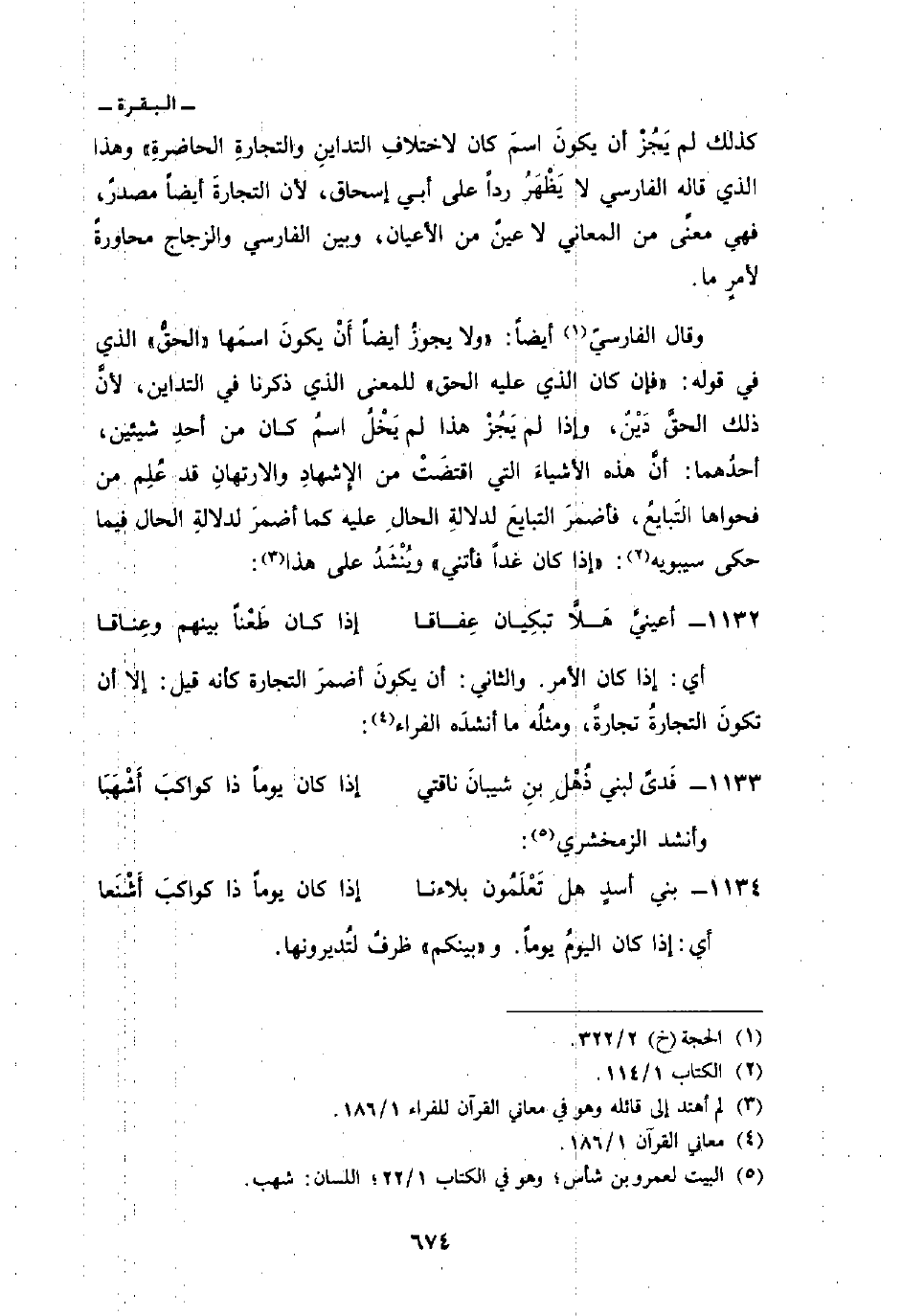 كذلك لم يَجُزْ أن يكونَ اسمَ كان لاختلافِ التداينِ والتجارةِ الحاضرةِ» وهذا الذي قاله الفارسي لا يَظْهَرُ رداً على أبي إسحاق، لأن التجارةَ أيضاً مصدرٌ، فهي معنىً من المعاني لا عينٌ من الأعيان، وبين الفارسي والزجاج محاورةٌ لأمرٍ ما.