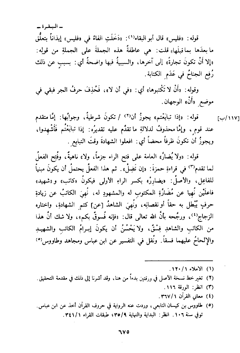 قوله: {فَلَيْسَ} قال أبو البقاء: «دَخَلَتِ الفاءُ في» فليس «إيذاناً بتعلُّق ما بعدَها بما قبلَها» قلت: هي عاطفةٌ هذه الجملةَ على الجملةِ من قولِه: {إِلاَّ أَن تَكُونَ تِجَارَةً} إلى آخرها، والسببيةُ فيها واضحةُ أي: بسببٍ عن ذلك رُفِع الجناحُ في عَدَمِ الكتابة.