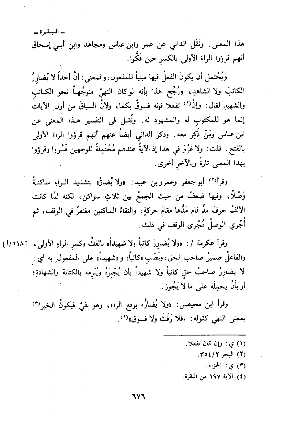 ويُحْتمل أن يكونَ الفعلُ فيها مبنياً للمفعول، والمعنى: أَنَّ أحداً لا يُضارِرُ الكاتبَ ولا الشاهدِ، ورُجِّح هذا بأنه لو كان النهيُّ متوجِّهاً نحو الكاتبِ والشهيدِ لقال: وإنْ تفعلا فإنه فسوقٌ بكما، ولأنَّ السياقَ من أولِ الآيات إنما هو للمكتوبِ له والمشهودِ له. ونُقِل في التفسير هذا المعنى عن ابن عباس ومَنْ ذُكِر معه. وذكر الداني أيضاً عنهم أنهم قرؤوا الراءَ الأولى بالفتح. قلت: ولا غَرْوَ في هذا إذ الآيةُ عندهم مُحْتَمِلةٌ للوجهين فَسَّروا وقرؤوا بهذا المعنى تارةً وبالآخرِ أخرى.
