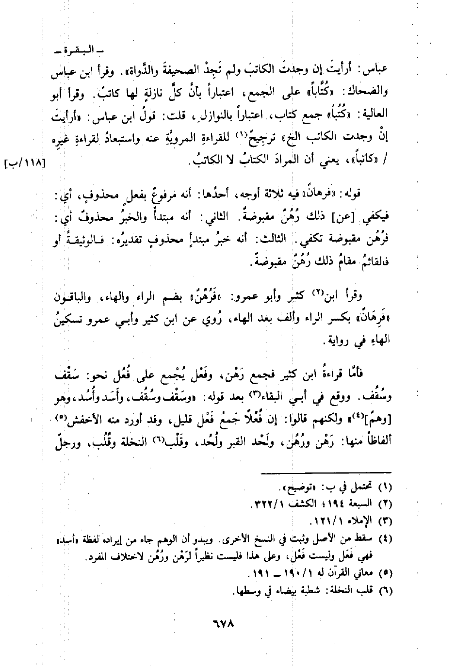 عباس: أرأيتَ إن وجدتَ الكاتبَ ولم تَجِدْ الصحيفةَ والدَّواة» . وقرأ ابن عباس والضحاك: «كُتَّاباً» على الجمع، اعتباراً بأنَّ كلَّ نازلةٍ لها كاتبٌ. وقرأ أبو العالية: «كُتُباً» جمع كتاب، اعتباراً بالنوازلِ، قلت: قولُ ابن عباس: «أرأيتَ إنْ وجدت الكاتب الخ» ترجِيحٌ للقراءةِ المرويَّةِ عنه واستبعادٌ لقراءةِ غيرِه/ «كاتباً» ، يعني أن المرادَ الكتابُ لا الكاتبُ.