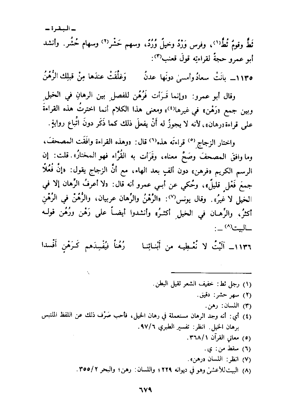 واختار الزجاجِ قراءتَه هذه قال: «وهذه القراءة وافَقَت المصحفَ، وما وافقَ المصحفَ وصَحَّ معناه، وقَرَأت به القُرَّاء فهو المختارُ» . قلت: إن الرسم الكريم «فرهن» دون ألفٍ بعد الهاء، مع أنَّ الزجاج يقول: «إنَّ فُعُلاً جمعَ فَعْلٍ قليلٌ» ، وحُكي عن أبي عمرو أنه قال: «لا أعرفُ الرِّهان إلا في الخيل لا غير» . وقال يونس: «الرَّهْنُ والرِّهان عربيان، والرُّهُنْ في الرَّهْنِ أكثرُ، والرِّهان في الخيلِ أكثرُ» وأنشدوا أيضاً على رَهْن ورُهُن قوله - البيت -: