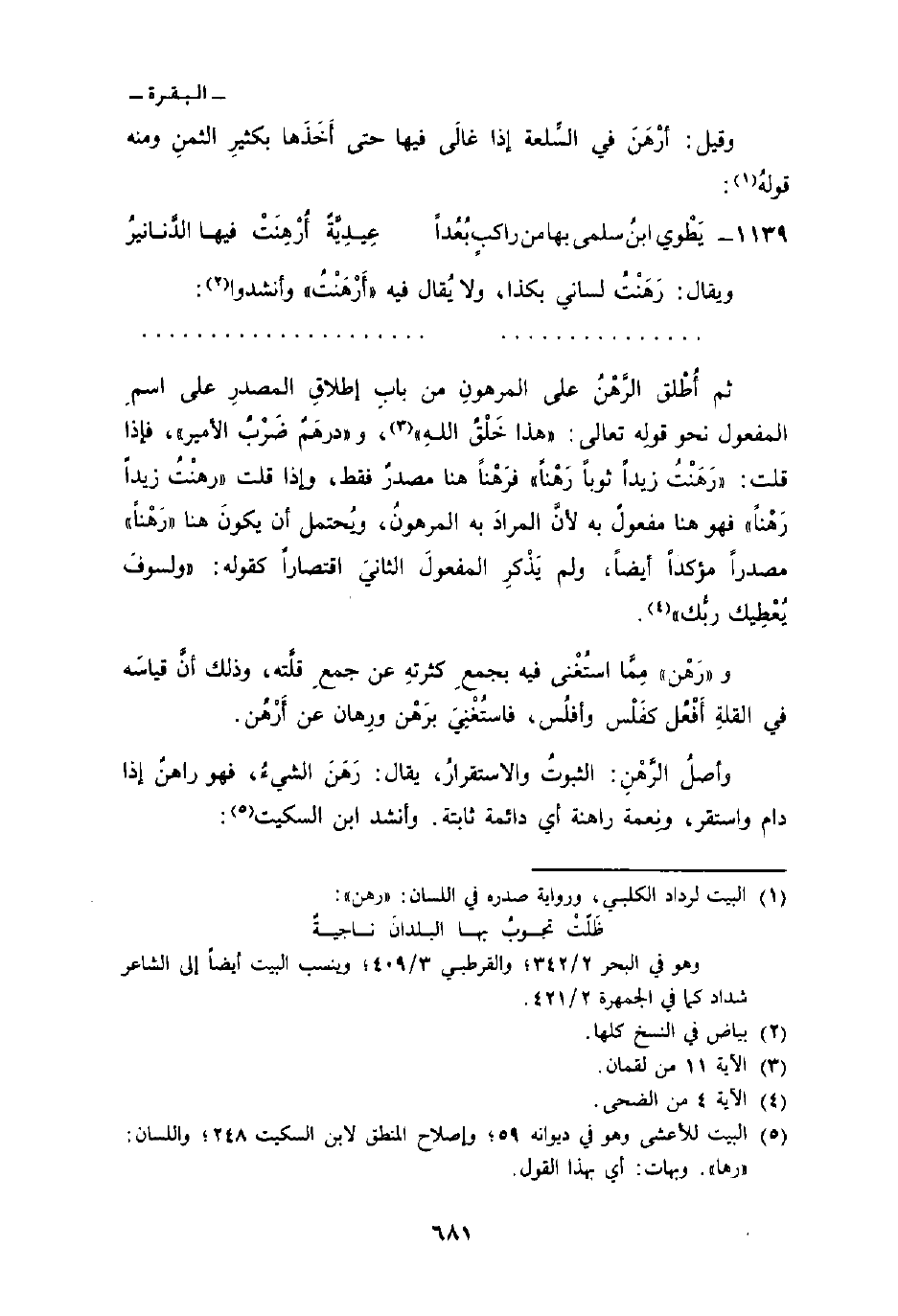 و» رَهْن «مِمَّا استُغْنى فيه بجمعِ كثرتِه عن جمعِ قلَّته، وذلك أنَّ قياسَه في القلةِ أَفْعُل كفَلْس وأفلُس، فاستُغْنِيَ برَهْن ورِهان عن أَرْهُن.