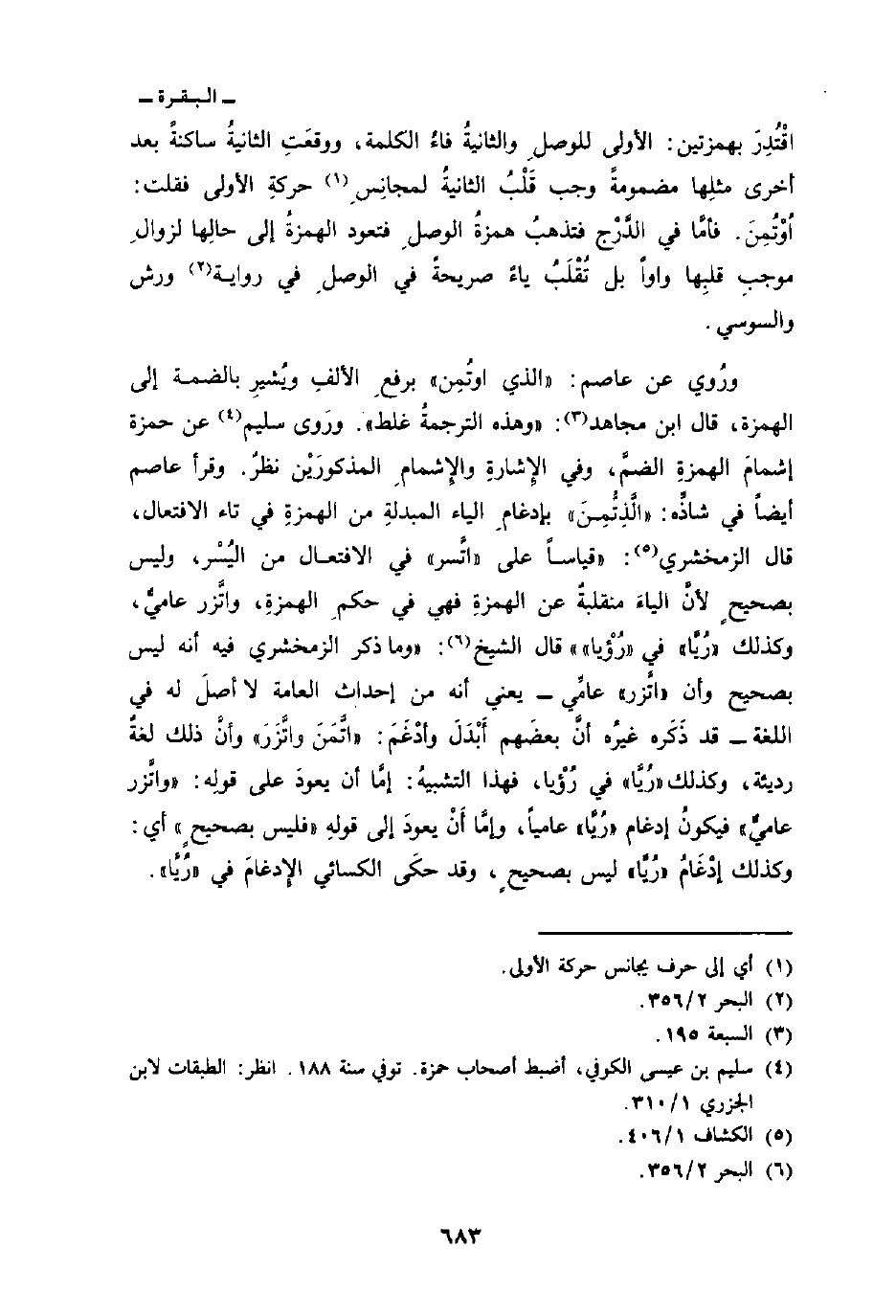 ورُوي عن عاصم:» الذي اوتُمِن «برفعِ الألفِ ويُشيرِ بالضمة إلى الهمزة، قال ابن مجاهد:» وهذه الترجمةُ غلط «. ورَوى سليم عن حمزة إشمامَ الهمزةِ الضمَّ، وفي الإِشارة والإِشمامِ المذكورَيْن نظرٌ. وقرأ عاصم أيضاً في شاذِّة:» الَّذِتُّمِنَ «بإدغامِ الياء المبدلةِ من الهمزةِ في تاء الافتعال، قال الزمخشري:» قياساً على «اتَّسر» في الافتعال من اليُسْر، وليس بصحيحٍ لأنَّ الياءَ منقلبةٌ عن الهمزةِ فهي في حكمِ الهمزةِ، واتَّزر عاميُّ، وكذلك «رُيَّا» في «رُؤْيا» قال الشيخ: «وما ذكر الزمخشري فيه أنه ليس بصحيح وأن» اتَّزر «عامِّي - يعني أنه من إحداث العامة لا أصلَ له في اللغة - قد ذَكَره غيرُه أنَّ بعضَهم أَبْدَلَ وأدْغَمَ:» اتَّمَنَ واتَّزَرَ «وأنَّ ذلك لغةٌ رديئة، وكذلك» رُيَّا «في رُؤْيا، فهذا التشبيهُ: إمَّا أن يعودَ على قولِه:» واتَّزر عاميٌّ «فيكونُ إدغام» رُيَّا «عامياً، وإمَّا أَنْ يعودَ إلى قولِه» فليس بصحيحٍ «أي: وكذلك إدْغَامُ» رُيَّا «ليس بصحيحٍ، وقد حكَى الكسائي الإِدغمَ في» رُيَّا «.