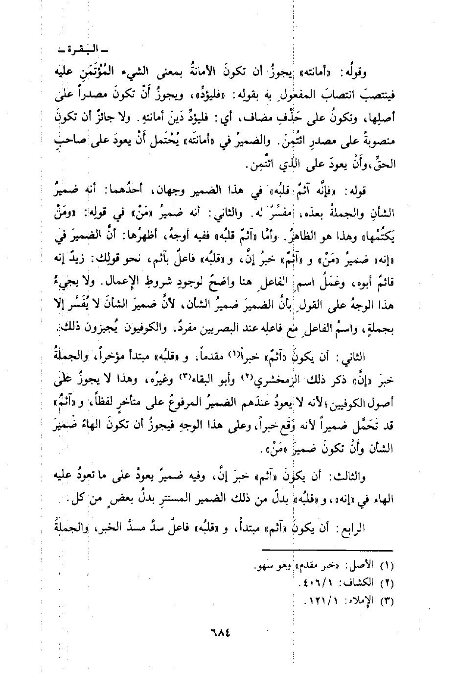 الثاني: أن يكونَ «آثمٌ» خبراً مقدماً، و «قلبُه» مبتدأ مؤخراً، والجملةُ خبرَ «إنَّ» ذكر ذلك الزمخشري وأبو البقاء وغيرُه، وهذا لا يجوزُ على أصول الكوفيين؛ لأنه لا يعودُ عندَهم الضميرُ المرفوعُ على متأخرٍ لفظاً، و «آثمٌ» قد تَحَمَّل ضميراً لأنه وَقَع خبراً، وعلى هذا الوجهِ فيجوزُ أن تكونَ الهاءُ ضميرَ الشأن وأَنْ تكونَ ضميرَ «مَنْ» .