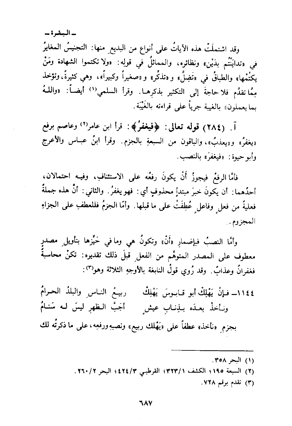 قوله تعالى: {فَيَغْفِرُ} قرأ ابن عامر وعاصم برفع «يغفرُ» و «يعذبُ» ، والباقون من السبعةِ بالجزم. وقرأ ابنُ عباس والأعرج وأبو حيوة: «فيغفرَ» بالنصب.