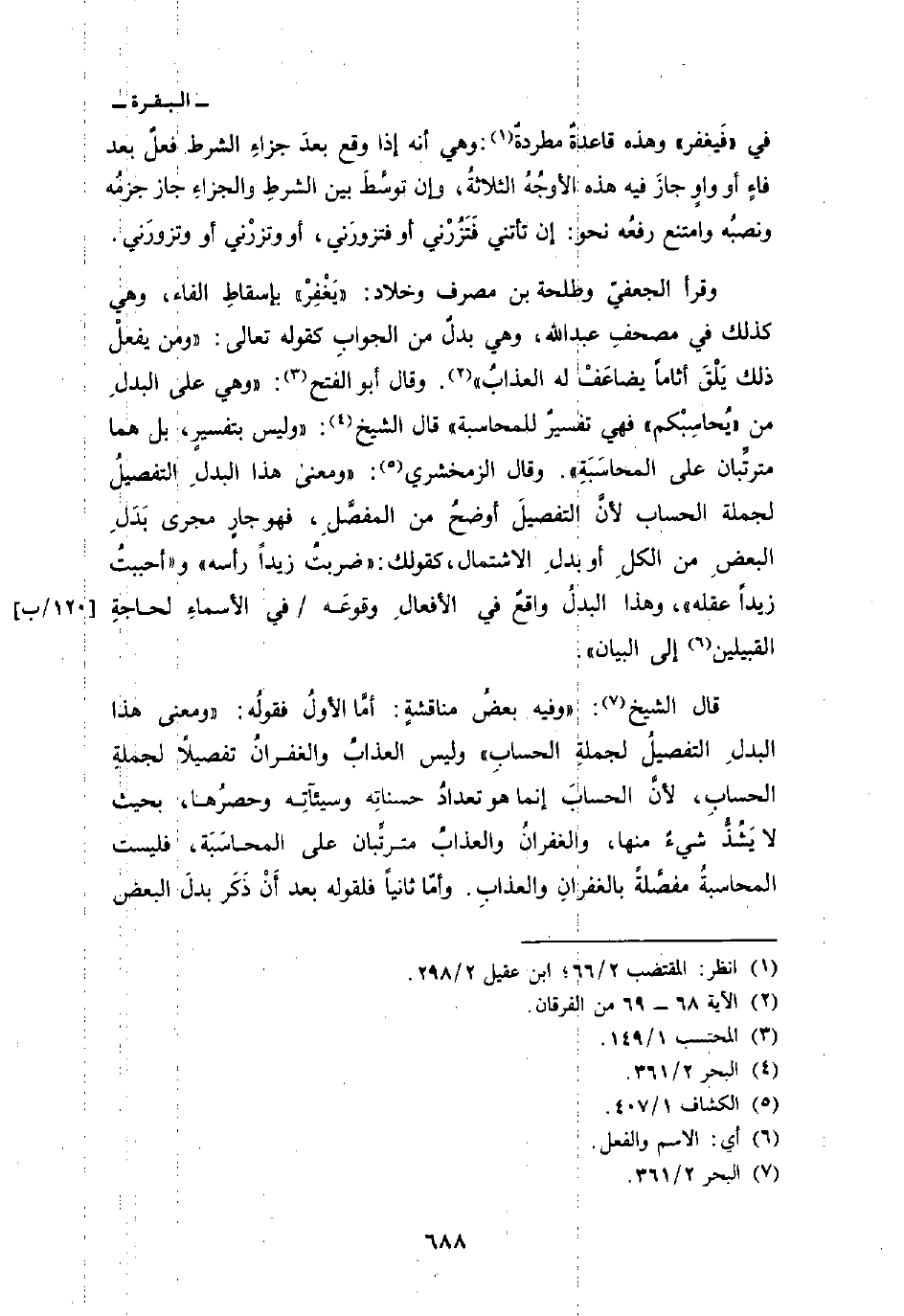 وقرأ الجعفيّ وطلحة بن مصرف وخلاد: «يَغْفِرْ» بإسقاطِ الفاء، وهي كذلك في مصحفِ عبد الله، وهي بدلٌ من الجوابِ كقوله تعالى: {وَمَن يَفْعَلْ ذلك يَلْقَ أَثَاماً يُضَاعَفْ لَهُ العذاب} [الفرقان: 68-69] . وقال أبو الفتح: «وهي على البدلِ من» يُحاسِبْكم «فهي تفسيرٌ للمحاسبة» قال الشيخ: «وليس بتفسيرٍ، بل هما مترتِّبان على المحاسَبَةِ» . قال الزمخشري: «ومعنى هذا البدلِ التفصيلُ لجملة الحساب لأنَّ التفصيلَ أوضحُ من المفصَّلِ، فهو جارٍ مجرى بَدَلِ البعضِ من الكلِ أو بدلِ الاشتمال، كقولك:» ضربتُ زيداً رأسه «و» أحببتُ زيداً عقله «، وهذا البدلُ واقعٌ في الأفعالِ وقوعَه/ في الأسماءِ لحاجةِ القبيلين إلى البيان» .