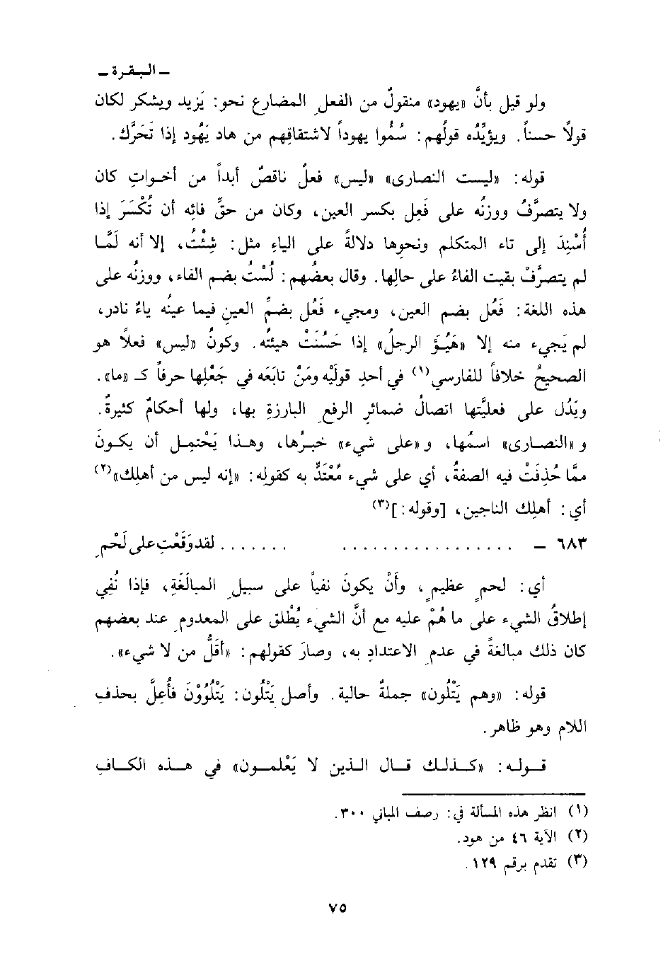 قوله: {لَيْسَتِ النصارى} » ليس «فعلٌ ناقصٌ أبداً من أخواتِ كان ولا يتصرَّفُ ووزنُه على فَعِل بكسر العين، وكان من حقِّ فائِه أن تُكْسَرَ إذا أُسْنِدَ إلى تاء المتكلم ونحوِها دلالةًعلى الياءِ مثل: شِئْتُ، إلا أنه لَمَّا لم يتصرَّفْ بقيت الفاءُ على حالِها، وقال بعضُهم: لُسْتُ بضم الفاء، ووزنُه على هذه اللغة: فَعُل بضم العين، ومجيء فَعُل بضمِّ العينِ فيما عينُه ياءٌ نادر، لم يَجيء منه إلا» هَيُؤَ الرجلُ «إذا حَسُنَتْ هيئتُه. وكونُ» ليس «فعلاً هو الصحيحُ خلافاً للفارسي في أحدِ قولَيْه ومَنْ تابَعَه في جَعْلِها حرفاً ك» ما «ويَدُل على فعليَّتها اتصالُ ضمائرِ الرفعِ البارزةِ بها، ولها أحكامٌ كثيرةٌ. و» النصارى «اسمُها، و» على شيء «خبرُها، وهذا يَحْتمِل أن يكونَ ممَّا حُذِفَتْ فيه الصفةُ، أي على شيء مُعْتَدٍّ به كقولِه:» إنه ليس من أهلِك «أي: أهلِك الناجين، [وقوله:]