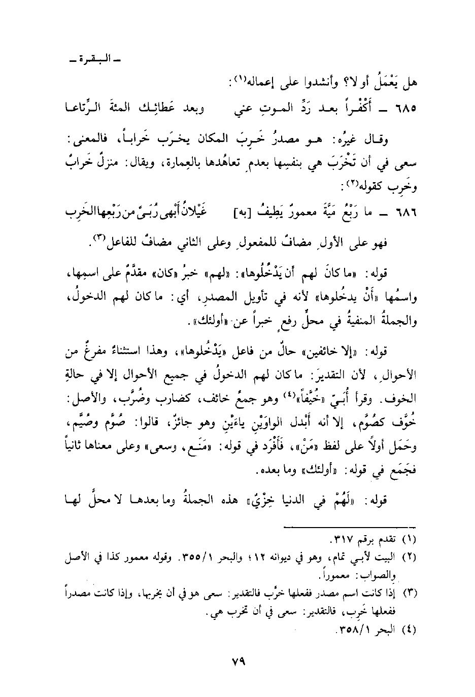 قوله: {إِلاَّ خَآئِفِينَ} حالٌ من فاعل» يَدْخُلوها «، وهذا استثناءٌ مفرغٌ من الأحوالِ، لأن التقديرَ: ما كان لهم الدخولُ في جميع الأحوال إلا في حالةِ الخوف. وقرأ أُبَيّ» خُيَّفاً «وهو جمعُ خائف، كضارب وضُرَّب، والأصل: خُوَّف كصُوَّم، إلا أنه أَبْدل الواوَيْنِ ياءَيْنِ وهو جائزٌ، قالوا: صُوَّم وصُيَّم، وحَمَل أولاً على لفظ» مَنْ «، فَأَفْرَد في قوله:» مَنَع، وسعى «وعلى معناها ثانياً فجَمَع في قوله:» أولئك «وما بعده.