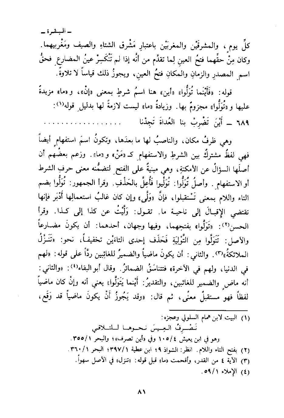 وهي ظرفُ مكان، والناصبُ لها ما بعدَها، وتكونُ اسمَ استفهامٍ أيضاً فهي لفظٌ مشتركٌ بين الشرطِ والاستفهامِ ك «مَنْ» و «ما» . وزعم بعضُهم أن أصلَها السؤالُ عن الأمكنةِ، وهي مبنيةٌ على الفتحِ لتضمُّنه معنى حرفِ الشرط أو الاستفهامِ. وأصلُ تُوَلُّوا: تُوَلِّيوا فَأُعِلَّ بالحَذْفِ. وقرأ الجمهور: تُوَلُّوا بضم التاء واللام بمعنى تَسْتقبلوا، فإنَّ «وَلَّى» وإن كان غالبُ استعمالِها أَدْبَر فإنها تقتضي الإِقبالَ إلى ناحية ما. تقول: وَلَّيْتُ عن كذا إلى كذا. وقرأ الحسن: «تَوَلَّوا» بفتحِهما، وفيها وجهان، أحدهما: أن يكونَ مضارعاً والأصل: تَتَوَلَّوا مِن التَّوْلِيَةِ فَحَذَف إحدى التاءَيْن تخفيفاً، نحو: {تَنَزَّلُ الملائكة} [القدر: 4] . والثاني: أن يكونَ ماضياً والضميرُ للغائِبين ردَّاً على قوله: «لهم في الدنيا، ولهم في الآخرة» فتتناسَقُ الضمائرُ، وقال أبو البقاء: «والثاني: أنه ماضٍ والضمير للغائبين، والتقديرُ: أَيْنما يَتَوَلَّوا» يعني أنه وإنْ كان ماضياً لفظاً فهو مستقبلٌ معنىً، ثم قال: «وقد يَجُوزُ أَنْ يكونَ ماضياً قد وَقَع،