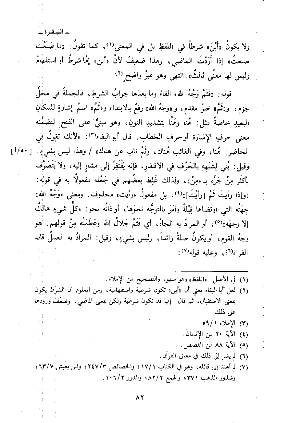 قوله: {فَثَمَّ وَجْهُ الله} الفاءُ وما بعدَها جوابُ الشرطِ، فالجملةُ في محلِّ جزم، و «ثَمَّ» خبرٌ مقدم، و «وجهُ الله» رفعٌ بالابتداء و «ثَمَّ» اسمُ إشارةٍ للمكانِ البعيدِ خاصةً مثل: هُنا وهَنَّا بتشديدِ النونِ، وهو مبنيٌّ على الفتحِ لتضمُّنِه معنى حرفِ الإشارة أو حرفِ الخطاب. قال أبو البقاء: «لأنك تقولُ في الحاضر: هُنا، وفي الغائب هُناك، وثَمَّ ناب عن هناك» / وهذا ليس بشيءٍ. وقيل: بُني لِشَبَهِهِ بالحَرْفِ في الافتقارِ، فإنه يَفْتَقِرُ إلى مشارٍ إليه، ولا يَتَصَرَّف بأكثَر مِنْ جَرِّه ب «مِنْ» ، ولذلك غَلِط بعضُهم في جَعْله مفعولاً به في قوله: {وَإِذَا رَأَيْتَ ثَمَّ [رَأَيْتَ] } [الإنسان: 20] ، بل مفعولُ «رأيت» محذوف. ومعنى «وَجْهُ الله» جِهَتُه التي ارتضاها قِبْلةً وأمَرَ بالتوجُّه نحوَها، أو ذاتُه نحو: {كُلُّ شَيْءٍ هَالِكٌ إِلاَّ وَجْهَهُ} [القصص: 88] ، أو المرادُ به الجاهُ، أي فَثَمَّ جَلالُ الله وعَظَمَتُه مِنْ قولِهم: هو وجهُ القوم، أو يكونُ صلةً زائداً، وليس بشيءٍ، وقيل: المرادُ به العملُ قاله الفراء وعليه قوله: