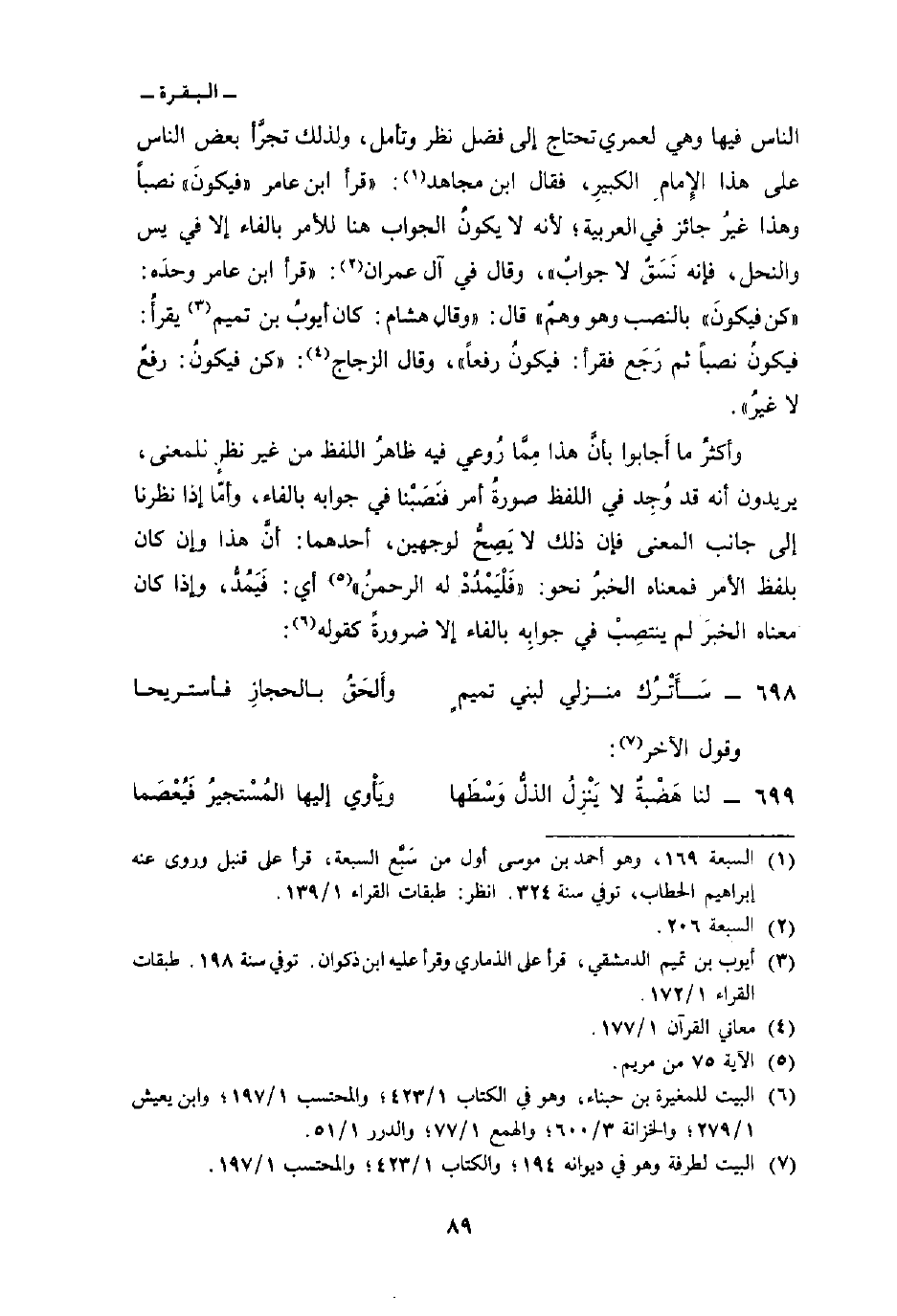 الناس فيها وهي لعمري تحتاج إلى فضل نظر وتأمل، ولذلك تجرَّأ بعض الناس على هذا الإِمام الكبيرِ، فقال ابن مجاهد:» قرأ ابن عامر «فيكونَ» نصباً وهذا غيرُ جائز في العربية؛ لأنه لا يكونُ الجواب هنا للأمر بالفاء إلا في يس والنحل، فإنه نَسَقٌ لا جوابٌ «، وقال في آل عمران:» قرأ ابن عامر وحدَه: «كن فيكونَ» بالنصب وهو وهمٌ «قال:» وقال هشام: كان أيوبُ بن تميم يقرأُ: فيكونُ نصباً ثم رَجَع فقرأ: فيكونُ رفعاً «، وقال الزجاج:» كن فيكونُ: رفعٌ لا غيرُ «.