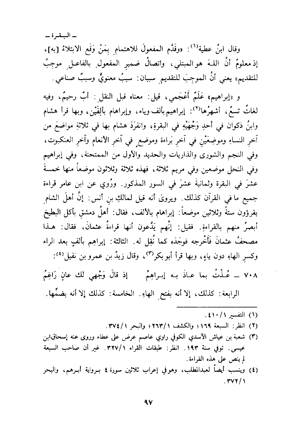 و» إبراهيم «عَلَمٌ أَعْجَمي، قيل: معناه قبل النقلِ: أبٌ رحيمٌ، وفيه لغاتٌ تسعٌ، أشهرُها: إبراهيم بألف وياء، وإبراهام بألِفَيْن، وبها قرأ هشام وابنُ ذكوان في أحدِ وَجْهَيْهِ في البقرةِ، وانفرَدَ هشام بها في ثلاثةِ مواضعَ من آخرِ النساءِ وموضِعَيْنِ في آخرِ بَراءة وموضعٍ في آخرِ الأنعام وآخرِ العنكبوت، وفي النجم والشورى والذاريات والحديد والأول من الممتحنة، وفي إبراهيم وفي النحل موضعين وفي مريم ثلاثة، فهذه ثلاثة وثلاثون موضعاً منها خمسةَ عشرَ في البقرة وثمانيةَ عشرَ في السور المذكور. ورُوي عن ابن عامر قراءة جميع ما في القرآن كذلك. ويروى أنه قيل لمالكِ بنِ أنس: إنَّ أهلَ الشامِ يقرؤون ستةً وثلاثين موضعاً: إبراهام بالألف، فقال: أهلُ دمشقِ بأكل البطيخ أبصرُ منهم بالقرآءة. فقيل: إنَّهم يَدَّعون أنها قراءةُ عثمانَ، فقال: هذا مصحفُ عثمانَ فَأَخْرجه فوجَدَه كما نُقِل له. الثالثة: إبراهِم بألفٍ بعد الراء وكسرِ الهاءِ دون ياءٍ، وبها قرأ أبو بكر، وقال زيدٌ بن عمرو بن نفيل: