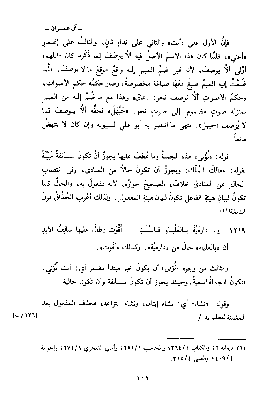 والثالث من وجوه «تُؤتي» أن يكونَ خبرَ مبتدأ مضمر أي: أنت تُؤتي، فتكونُ الجلمةُ اسميةً، وحينئذ يجوز أن تكونَ مستأنفة وأن تكون حالية.