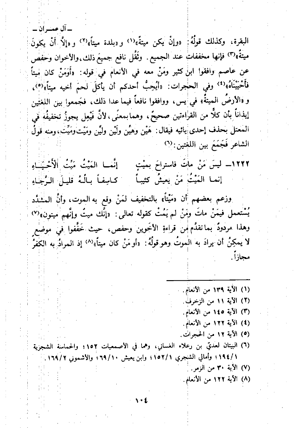 وزعم بعضهم أن «مَيْتاً» بالتخفيف لمَنْ وقع به الموت، وأنَّ المشدَّد يُستعمل فيمَنْ ماتَ ومَنْ لم يَمُتْ كقوله تعالى: {إِنَّكَ مَيِّتٌ وَإِنَّهُمْ مَّيِّتُونَ} [الزمر: 30] وهذا مردودٌ بما تقدَّم من قراءةِ الأخَوين وحفص، حيث خَفَّفوا في موضعٍ لا يمكِنُ أن يرادَ به الموتُ وهو قولُهُ: {أَوَ مَن كَانَ مَيْتاً} [الأنعام: 122] إذا المرادُ به الكفرُ مجازاً.