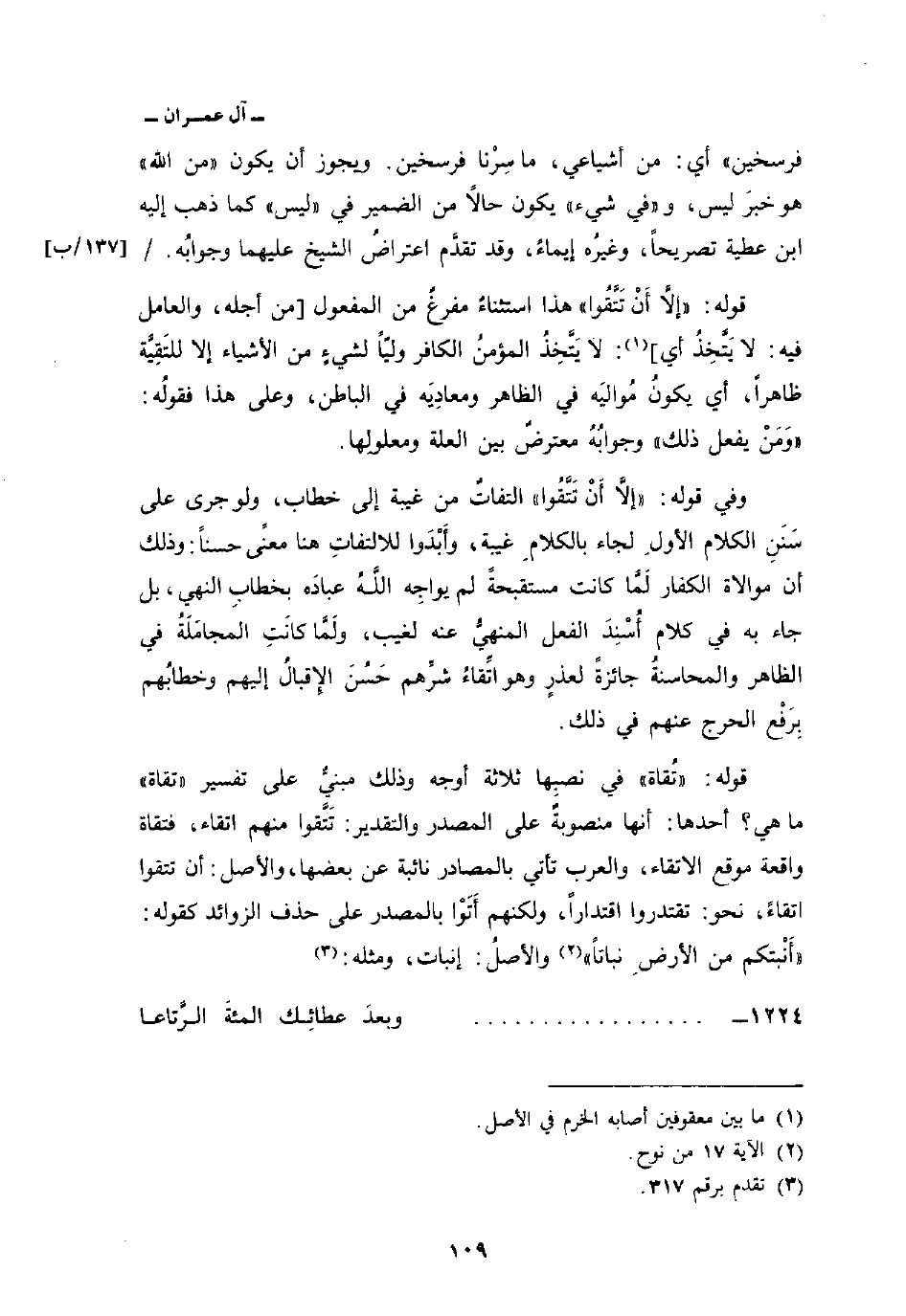 قوله: {تُقَاةً} في نصبِها ثلاثة أوجه وذلك مبنيٌّ على تفسير «تقاة» ما هي؟ أحدها: أنها منصوبةٌ على المصدر والتقدير: تَتَّقوا منهم اتقاء، فتقاة واقعة موقع الاتقاء، والعرب تأتي بالمصادر نائبة عن بعضها، والأصل: أن تتقوا اتقاءً، نحو: تقتدروا اقتداراً، ولكنهم أَتَوْا بالمصدر على حذف الزوائد كقوله: {أَنبَتَكُمْ مِّنَ الأرض نَبَاتاً} [نوح: 17] والأصلُ إنبات ومثله: