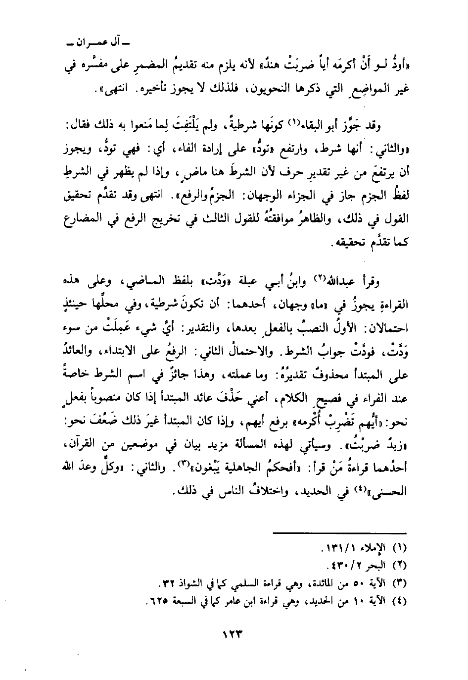 وقد جَوَّز أبو البقاء كونَها شرطيةً، ولم يَلْتَفِتْ لِما مَنعوا به ذلك فقال:» والثاني: أنها شرط، وارتفع «تودُّ» على إرادة الفاء. أي: فهي تودُّ، ويجوز أن يرتفعَ من غير تقديرِ حرف لأن الشرطَ هنا ماضٍ، وإذا لم يظهر في الشرطِ لفظُ الجزم جاز في الجزاء الوجهان: الجزمُ والرفع «. انتهى وقد تقدَّم تحقيق القول في ذلك، والظاهرُ موافقتُهُ للقول الثالث في تخريج الرفع في المضارع كما تقدَّم تحقيقه.