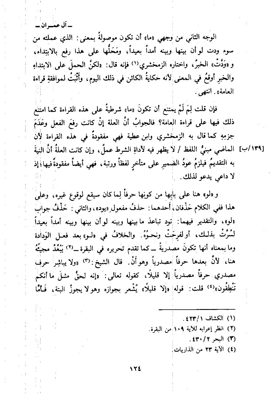 و «لو» هنا على بابِها من كونِها حرفاً لِما كان سيقع لوقوع غيره، وعلى هذا ففي الكلام حَذْفان، أَحدهما: حذفُ مفعولِ «يود» ، والثاني: حَذْفُ جواب «لو» ، والتقدير فيهما: تود تباعدَ ما بينها وبينه لو أن بينها وبينه أمداً بعيداً لسُرَّتْ بذلك، أو لفرِحَتْ ونحوُهُ. والخلافُ في «لو» بعد فعل الوَدادة وما بمعناه أنها تكونَ مصدريةً كما تقدم تحريره في البقرة يَبْعُدُ مجيئُهُ هنا، لأنَّ بعدها حرفاً مصدرياً وهو أَنْ. قال الشيخ: «ولا يباشِر حرف مصدري حرفاً مصدرياً إلا قليلاً، كقوله تعالى: {إِنَّهُ لَحَقٌّ مِّثْلَ مَآ أَنَّكُمْ تَنطِقُونَ} [الذاريات: 23] قلت: قوله» إلا قليلاً «يُشْعر بجوازه وهو لا يجوزُ البتة، فَأمَّا